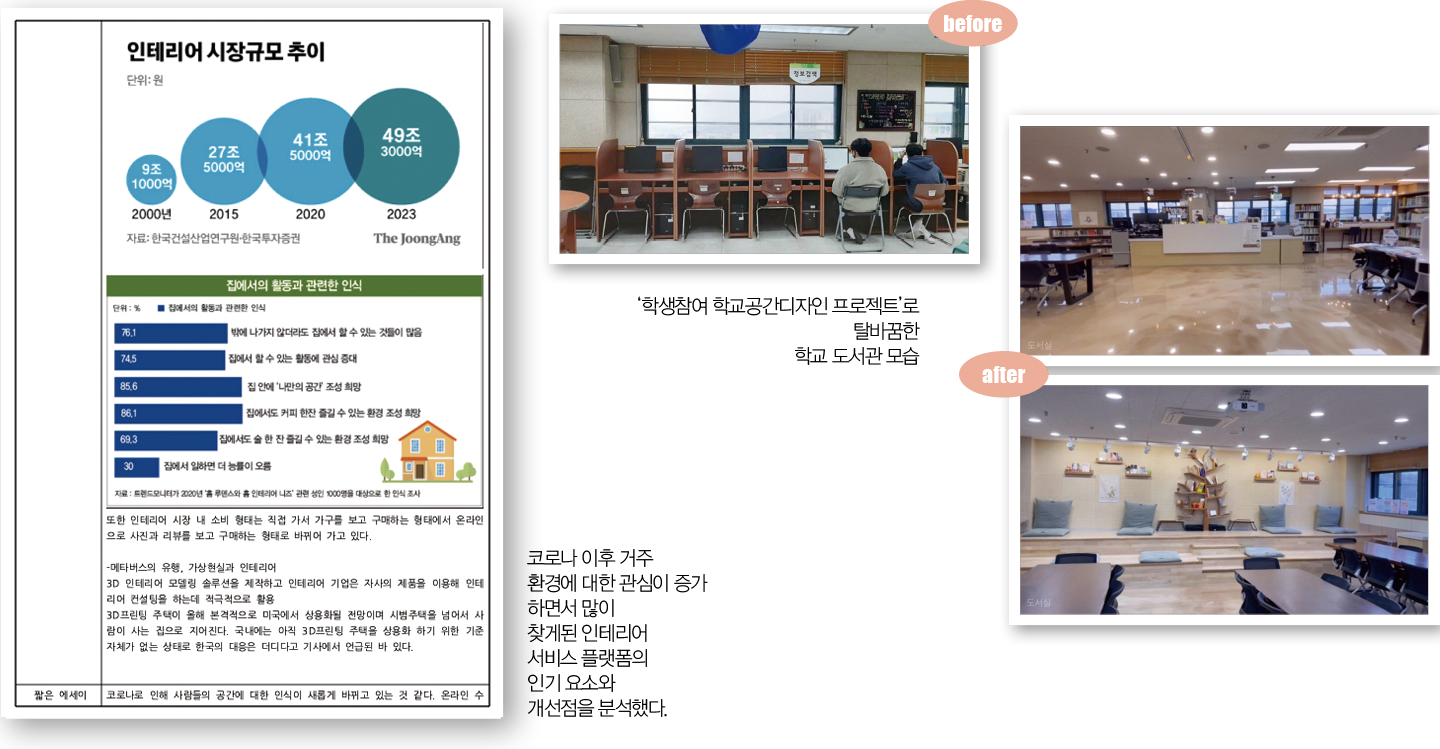 “하나는 ‘코로나로 인해 발전하는 인테리어 시장에 대한 연구’였어요. 인테리어 플랫폼과 3D 인테리어 구현 서비스를 분석하면서 앞으로 인테리어 시장이 더욱 온라인으로 집중될 것이며 가상현실과 결합한 서비스가 많이 나올 것이라 예측했어요. 또 ‘코로나로 인한 인테리어 트렌드의 변화’를 주제로 보고서를 작성했습니다. 아침에 학교나 일터로 나가고 늦게 집에 와서 잠만 자던 사람들이 갑자기 집에서 많은 시간을 보내게 됐죠. 집이 카페가 되고, 운동 장소가 됐어요. 특히 1인 가구 위주로 멀티 공간에 대한 수요가 높다는 내용과 코로나로 인한 문화생활 부족으로 ‘홈카페’, ‘홈캠핑’ 등의 변화가 만들어졌다는 내용의 보고서였어요.”