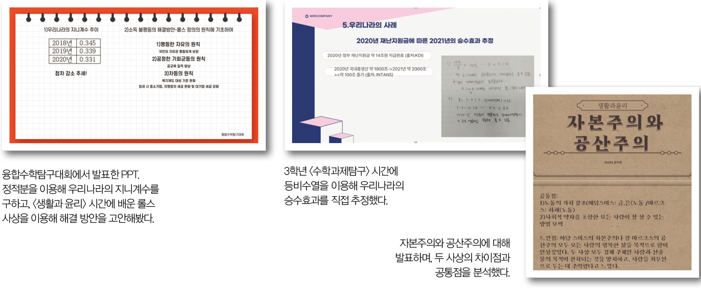 “정적분을 활용해 대한민국의 3년간의 지니계수를 구하면서 소득 불평등이 점차 감소되는 추세라는 것을 확인했지만 다른 나라와 비교했을 때 여전히 소득 불평등이 높은 편이더라고요. <생활과 윤리> 시간에 롤스의 사상을 접하면서 공교육의 질적 향상, 사회 복지 대상의 기준 완화 등의 해결책을 롤스의 정의의 원칙에 따라 고안해보기도 했습니다. 롤스의 사상이 사회 불평등을 인정하면서도 최소 수혜자를 고려하는 현실적 이상주의 성격을 띠고 있다고 느꼈거든요. 수학과 윤리학을 활용해 고민하는 과정을 거치면서 사회 문제를 여러 학문적 관점에서 바라보면 해결 방안을 다각도로 모색할 수 있겠다는 생각이 들었어요.”