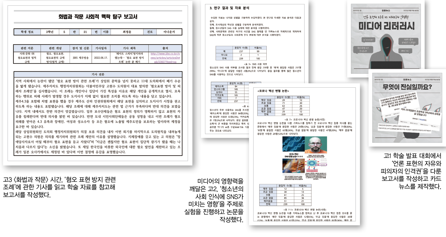 정윤씨는 2학년 때 미디어의 영향력을 돌아보는 실험도 진행했다. SNS를 통해 퍼져나간 가짜 뉴스를 의심 없이 믿는 댓글들을 본 정윤씨는 직접 가짜 뉴스를 제작해 학생들에게 보여주고 인식 조사를 했다. 설문 결과를 토대로 ‘SNS가 청소년의 사회 문제 인식에 미치는 영향’에 대한 논문을 작성했다. 3학년 <화법과 작문> 시간엔 ‘혐오 표현과 법적 규제’를 다룬 지문을 읽고 실제 법 조항을 찾아보며 <정치와 법> 과목의 자유 주제 탐구로 발전시켰다.