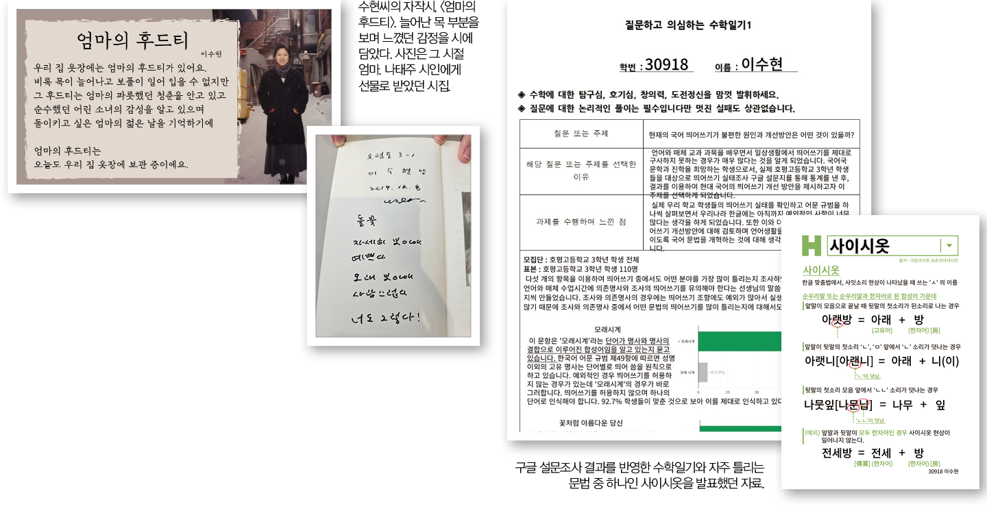 “<확률과 통계> 시간에 수학에 대한 관심이나 호기심을 기록하는 ‘수학일기’가 있었어요. 어떤 질문이나 주제를 수학적으로 접근하는 건데 그때 생각했던 주제가 띄어쓰기였어요. 3학년 전 학생을 대상으로 구글 설문자를 통해 띄어쓰기 실태조사를 했고, 이를 통계 내 현대 국어의 띄어쓰기 개선 방안을 제시했죠. 가장 기억에 남는 보고서였어요.”