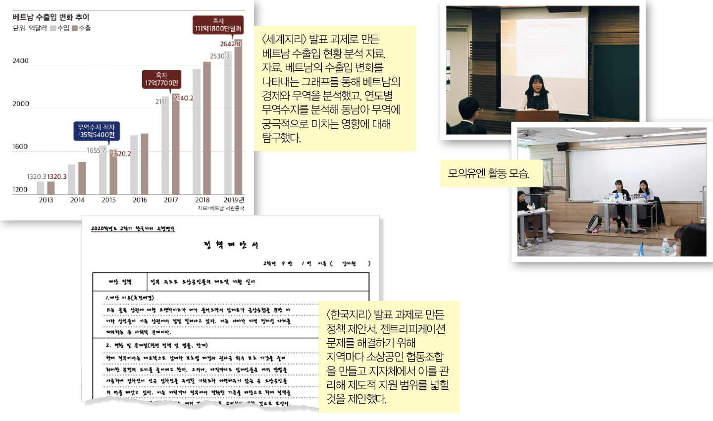 <화법과 작문> ‘착한 얼굴 속에 가려진 이면, 공정무역’이라는 주제 탐구 글을 통해 국제기구와 대기업, 노동자가 협의·상생해야 한다는 의견 제시 <확률과 통계> ‘성별에 따른 온라인 쇼핑 이용 현황’을 주제로 90명을 대상으로 설문 조사한 후 결과를 이산확률분포표로 만들어 발표 <세계지리> 베트남 수출입 변화(2013~2019) 그래프 분석을 통해 베트남 경제와 무역을 분석하는 우수 보고서를 작성 <일본어Ⅱ> 해외 자원개발 정책의 한계점을 그림과 도표를 활용해 발표