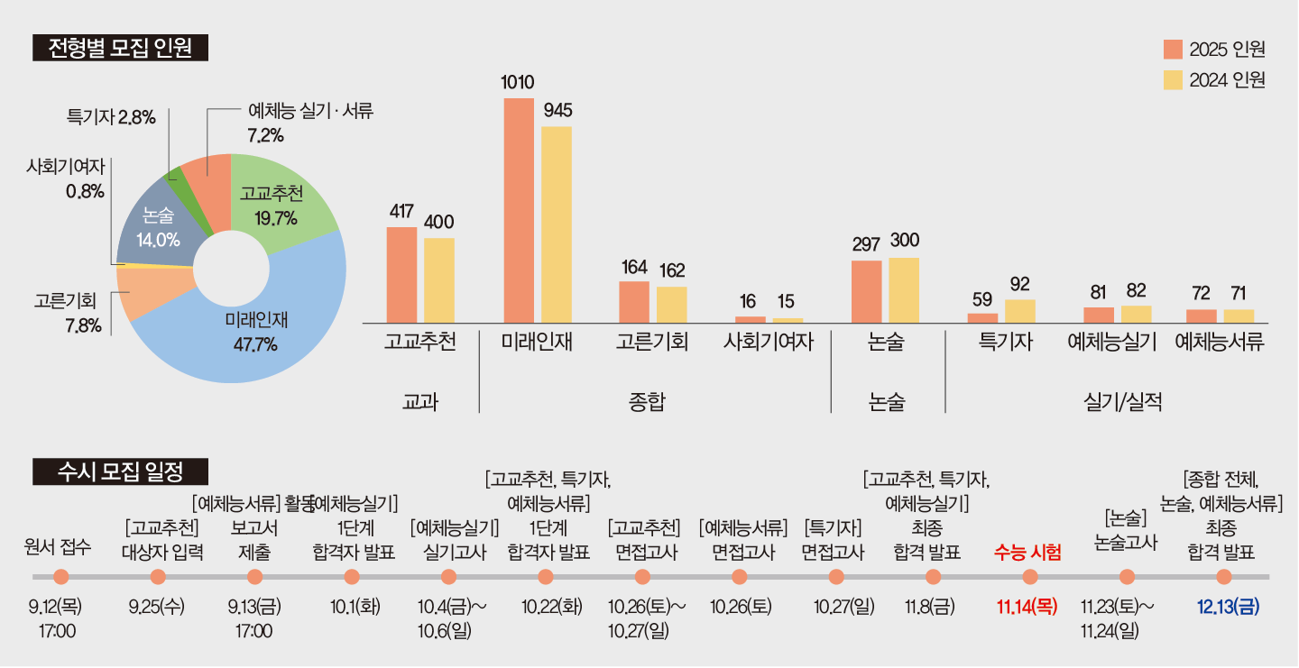 ‘인공지능데이터사이언스학부’의 확대·개편과 고교추천전형의 전형 방법 변경이다. 지난해 인공지능대학을 기존 2개 학과(인공지능학과 데이터사이언스학과)에서 4개 학과(인공지능학과 데이터사이언스학과 컴퓨터공학과 사이버보안학과)로 확대·개편한 데 이어 올해는 인공지능학과와 데이터사이언스학과를 통합해 인공지능데이터사이언스학부를 신설했다. 인공지능데이터사이언스학부의 정원도 113명으로 늘었으며, 공과대학의 융합전자반도체공학부 전자전기공학전공 정원도 64명으로 확대했다. 이를 통해 첨단 분야 창의·융합 인재를 적극 양성할 방침이다. 교과전형인 고교추천전형에도 여러 변화가 있다. 이번 연도부터 단계별 선발로 바뀌어 1단계 학생부교과(5배수 선발), 2단계 면접(20%)과 1단계 성적(80%)으로 선발한다. 교과 성적 반영 시 진로선택 과목의 비중이 기존 10%에서 20%로 높아졌으며, 고교별 추천 인원이 기존 재적 여학생 수의 5% 이내(최대 10명)에서 고교별 최대 20명으로 확대된다.