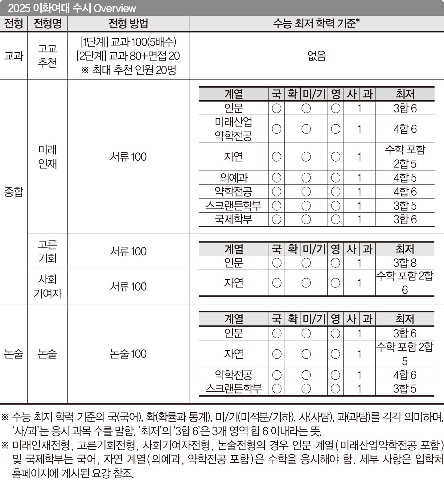 지원자 전체를 평가하고, 최저 기준을 적용해 일괄 선발한다. 즉, 최저 기준을 통과한 지원자 간 경쟁이라 실질 경쟁률이 낮아진다. 대학 발표 자료에 따르면 평균 최저 충족률은 40% 초반이다. 미래산업약학전공, 약학전공과 같이 최저 기준이 완화된 모집 단위에선 서류 평가의 영향력이 커질 것도 염두에 둬야 한다. 또 대학 입학 설명회에서 발표한 2024학년 미래인재전형 최종 등록자 인문 계열 합격자 평균은 2.80, 자연 계열은 1.94였는데, 이는 과학고보다 외국어고 학생의 지원 비율이 높기에 나타난 현상으로 보인다. 입학처 홈페이지에 게재된 2025학년 이화 입학 콘서트 영상과 2025학년 학생부 위주 전형 안내서를 반드시 확인해야 한다. 논술전형은 최근 몇 년간의 선행학습 영향 평가 보고서를 꼭 확인해야 한다. 기출문제와 출제 의도를 함께 파악할 수 있기 때문이다. 더불어 최저 기준 충족을 위한 수능 준비도 중요하다.