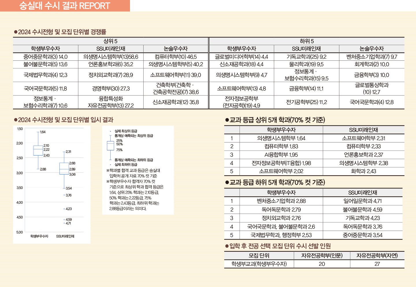 학생부종합전형에서 자기소개서가 폐지되고 학생부만으로 서류 평가와 면접 평가를 진행했다. 전년도 대비 경쟁률이 대폭 상승해 SSU미래인재의 경쟁률은 평균 17.6:1을 기록했다. 최종 합격자의 내신 등급도 평균 2.9등급으로 2023학년 대비 소폭 상승했다. 학생부종합평가에서는 학생부 기록의 모든 부분을 면밀하게 살펴보지만, 특히 지원자의 진로 탐색 노력과 계열 적합성을 살펴볼 수 있는 ‘선택 교과목 이수 내용’ ‘세부 능력 및 특기 사항’ 기록이 중요한 평가 자료이다. 최근 선택 과목이 다양하게 개설되고 이수할 수 있는 환경이 마련되면서 학생들이 자신의 적성과 흥미를 탐색하고, 관련 교과목을 적극적으로 이수하고 탐구하는 모습이 서류에서 다양하게 드러나고 있다.