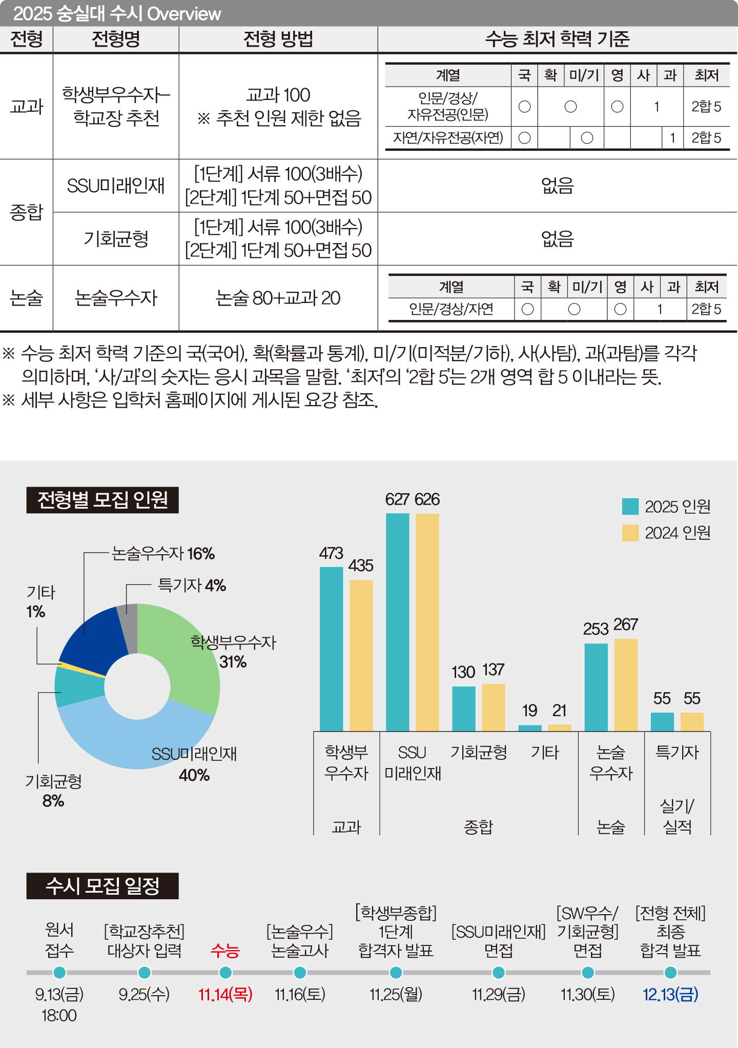 숭실대는 2025 대입 수시 모집에서 1천739명을 모집한다. 학생부교과전형인 학생부우수자는 473명을 선발하며 수능 최저 학력 기준으로 2개 영역 등급 합 5 이내를 적용한다. 자연 계열과 자유전공학부(자연) 모집 단위는 수능 수학에서 <미적분>과 <기하> 중 한 과목에 응시해야 한다. 수시전형 중 가장 많은 인원을 선발하는 전형은 학생부종합전형인 SSU미래인재로, 수시 전체 모집 인원의 30%가 넘는 627명을 선발한다. SSU미래인재의 전형 요소는 1단계 서류 100%, 2단계 서류 50%와 면접 50%로 면접 비중이 높으며 최저 기준은 없다. 논술전형은 논술 80%와 교과 20%로 선발하며, 최저 기준은 2개 영역 등급 합 5 이내이다. 숭실대 입학전략팀 문정호 과장에게 2025 수시 지원 시 주목해야 할 점을 들었다.