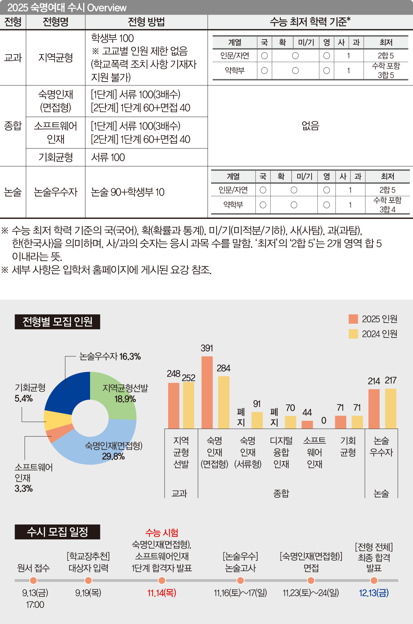 약학부를 제외한 자연 계열 모집 단위에서 서류 100%로 선발하던 숙명인재(서류형)과 디지털융합인재전형이 폐지됐다. 이에 따라 숙명인재(면접형)는 전년 대비 모집 인원이 늘었고, 자연 계열 모집 단위까지 면접을 실시한다. 인공지능공학부, 컴퓨터과학전공, 데이터사이언스전공을 선발하는 소프트웨어인재전형 역시 숙명인재(면접형)와 전형 방법은 동일하다. 논술전형 모집 단위에 약학부(4명)가 추가된 점도 눈여겨볼 만하다.