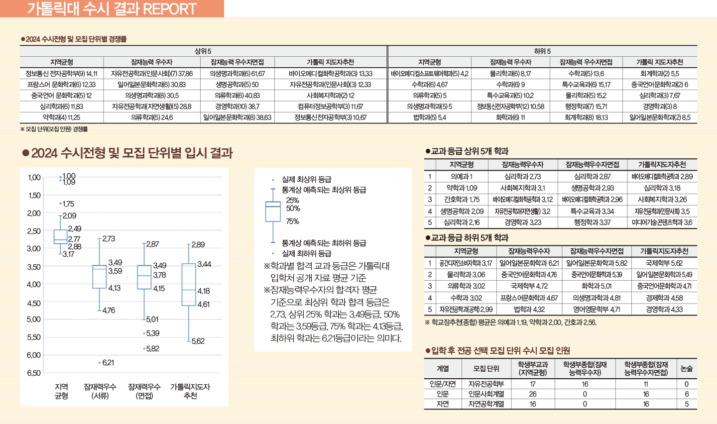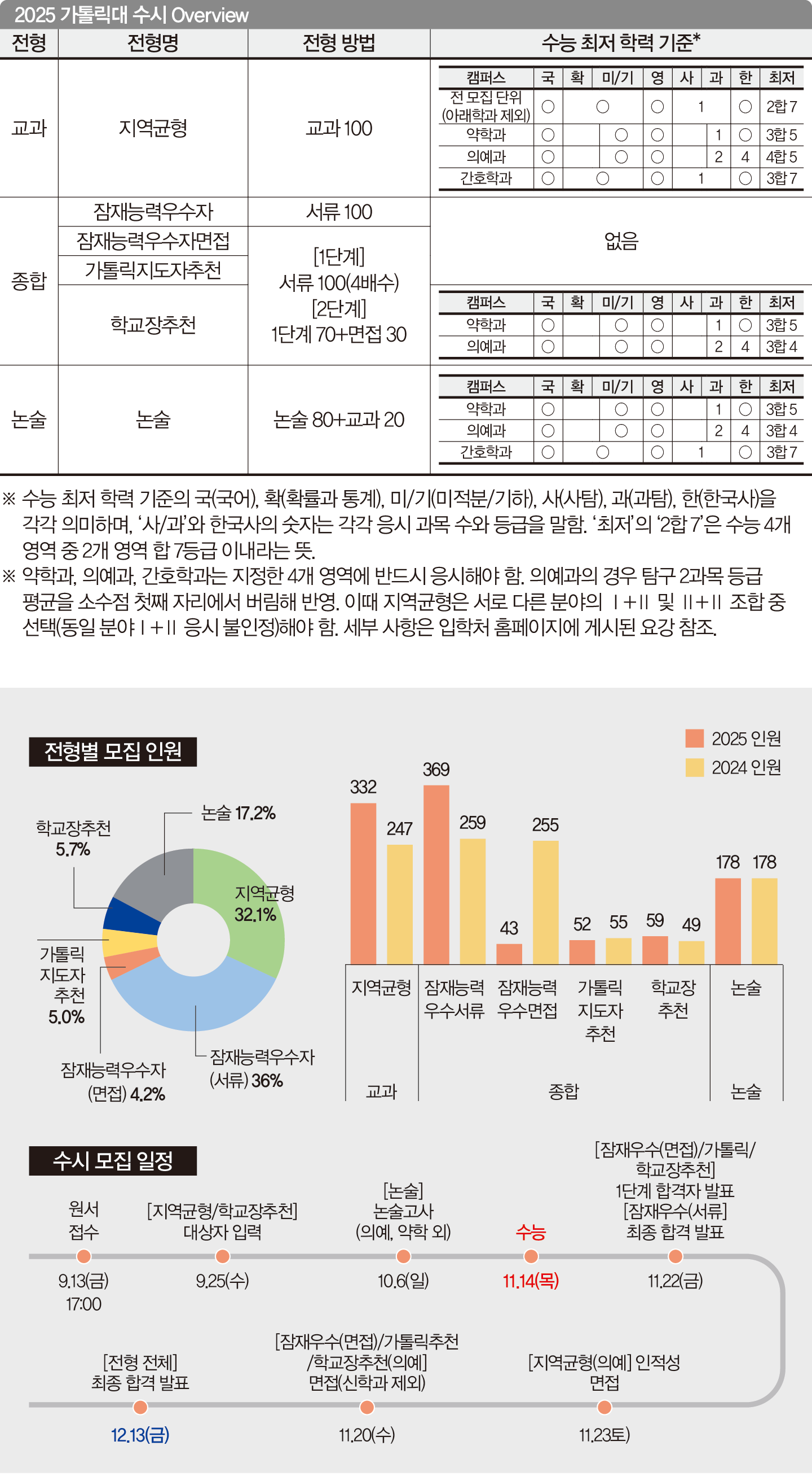 잠재능력우수자 및 잠재능력우수자면접은 서류 평가에서 학업 역량 35%, 진로 역량 45%, 공동체 역량 20%를, 학교장추천과 가톨릭지도자추천은 학업 역량 45%, 진로 역량 35%, 공동체 역량 20%를 반영하므로 평가 요소별 평가 항목 및 평가 내용을 반드시 확인해 적합한 전형을 찾아야 한다. 또 면접의 평가 요소 비율이 학업 역량 30%, 진로 역량 50%, 공동체 역량 20%임도 고려해 대비해야 한다. 홈페이지에서 면접 합격자 사례 영상을 참고하길 추천한다. 논술전형은 학생부 교과 반영 비율이 줄었다. 가톨릭대는 약학과, 의예과 논술은 수능 응시 이후에, 그 외 모집 단위는 9월 13일 수시 원서 접수 마감 약 3주 후인 10월 6일에 실시된다는 점을 유의해 준비해야 한다.