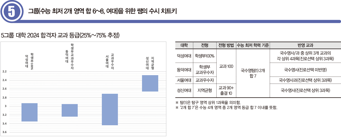 5그룹은 수능 2개 영역에서 각각 3, 4등급을 확보하면 최저 기준을 충족하기 수월한 여대다. 합격자 교과 성적은 일부 학과를 제외하고 일반적으로 2~3등급대로 형성된다. 최저 기준이 비슷해 대학 및 모집 단위 선호도에 따라 합격선이 달라지며, 특히 모집 단위에 따라 합격선 편차가 크다. 여학생이 선호하는 모집 단위일수록 합격선이 올라간다.