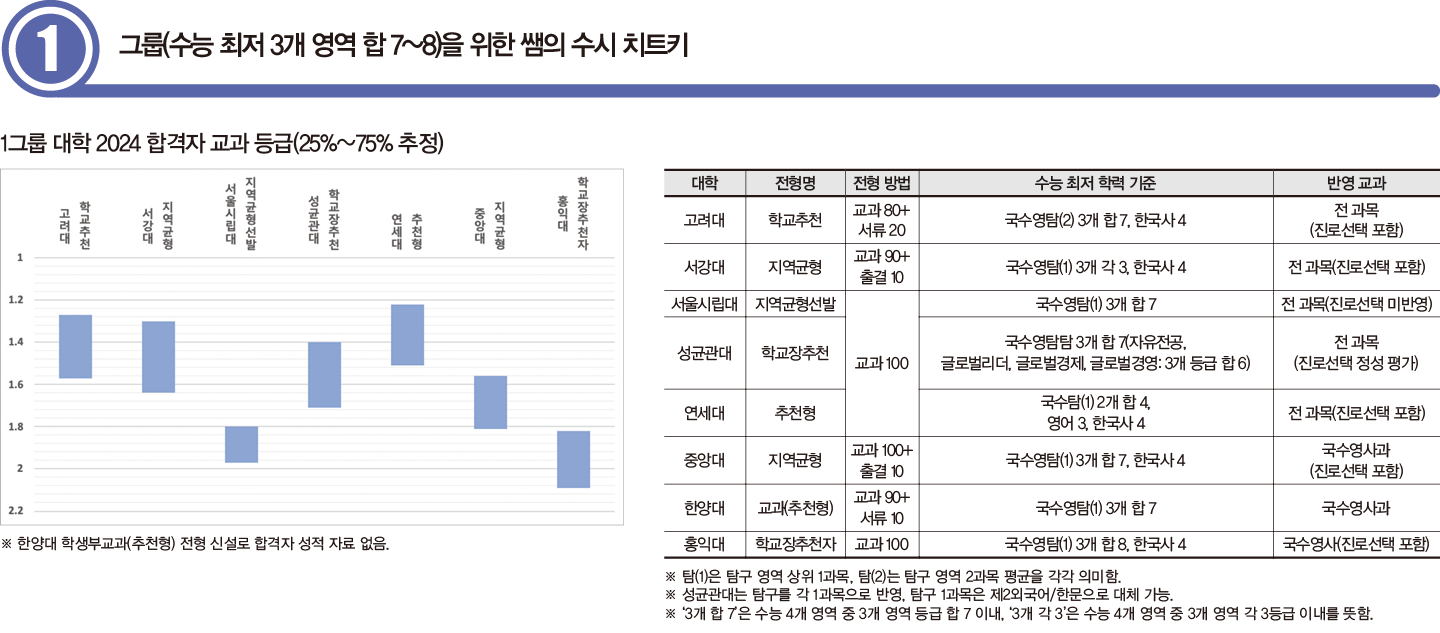 1그룹 대학의 교과 전형은 3개 영역을 기준으로 한 최저 기준을 적용한다. 충족이 까다로워 실제 합격선에서는 대학별, 학과별 편차가 커질 수 있다. 특히 인문 계열 수험생의 최저 충족률이 상대적으로 하락세다. 합격자의 교과 성적 기준은 국수영사 과목의 평균이지만 1그룹에 속하는 대학은 반드시 대학별 교과 환산 방식을 확인해야 한다. 특히 진로선택 과목 반영 비중이 높을수록 합격자의 교과 환산점은 더 상승할 수 있다.