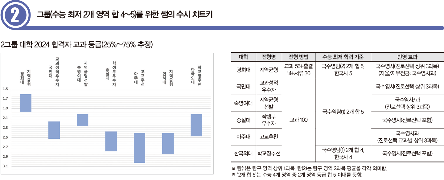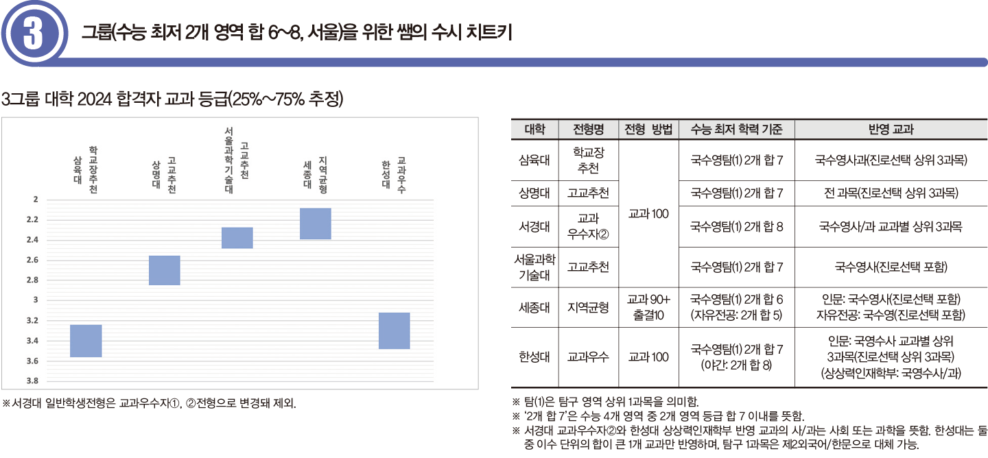 3그룹은 최저 기준이 수능 2개 영역에서 각각 3, 4등급을 확보하면 충족 가능한 서울권 대학이다. 최저 기준 충족이 비교적 수월하다. 합격자 교과 성적은 2등급대 혹은 그보다 낮게 형성된다. 최저 기준이 흡사해 대학 및 모집 단위 선호도에 따라 합격선이 달라진다. 3그룹부터 교과전형을 2개 전형으로 운영하는 대학이 등장하는 만큼, 최저 충족 가능성을 고려해 지원 전형을 선택해야 한다. 3그룹 대학은 최저 기준에서 탐구 영역을 상위 1과목만 반영하기에 탐구 2과목의 편차가 큰 수험생도 지원할 수 있다.