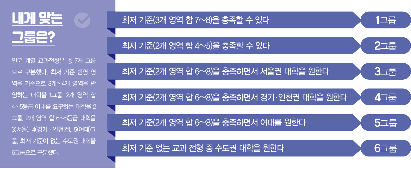 2그룹 대학의 교과전형은 최저 기준에 2개 영역만 반영해 상대적으로 부담이 적다. 하지만 등급 합이 4~5인 만큼, 2개 영역은 각각 2등급 혹은 3등급 이내라는 높은 기준을 충족해야 한다. 또 대학 선호도에 비해 최저 기준이 높은 대학은 합격선이 낮게 형성된다. 2그룹 이하 그룹에 속하는 대학은 교과전형에 주요 과목만 반영한다. 인문 계열 반영 교과는 대개 국어 수학 영어 사회다. 단, 진로선택 과목의 반영 방법은 대학마다 상이하다. 등급 평균으로는 대학 지원선만 결정하고, 세부 전략은 대학별 환산점을 따져 결정하라.