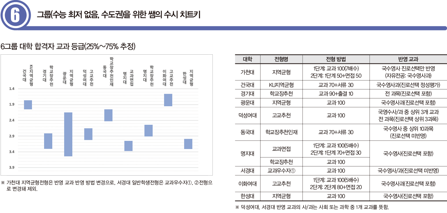 6그룹은 교과전형에 최저 기준을 적용하지 않는 수도권 대학이다. 교과 성적 외 서류와 면접 같은 전형 요소를 추가로 활용하며, 변수가 된다. 최저 기준이 있는 대학보다 충원율이 낮다. 추가 합격이 많지 않다는 얘기다. 한편 선호도 높은 모집 단위는 최초 합격자 성적이 꽤 높게 형성된다. 이 그룹에 지원하는 수험생이 대개 가장 안정 지원 카드로 선택하기 때문이다. 따라서 단순히 교과 성적만으로 합불을 예측하는 것은 위험하다.