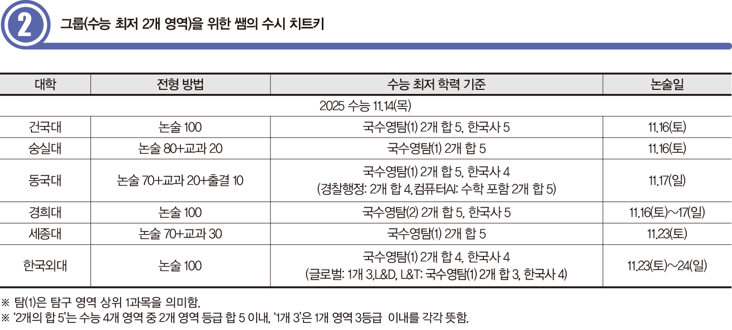 2그룹 대학은 최저 기준에 2개 영역을 반영하며, 모두 수능 이후 주말에 논술고사를 실시한다. 1그룹보다 지원 경쟁률과 실질 경쟁률의 차이가 적다. 하지만 대학·학과마다 최저 충족률의 편차가 있다. 경희대의 경우 평균 최저 충족률이 40% 내외로 낮은 편이며, 특히 건축학과(인문)는 29.7%로 평균을 훨씬 밑돌았다. 반면 건국대의 최저 충족률은 55% 내외였다. 상당수 대학의 실질 경쟁률은 20:1 안팎이었다. 한국외대 최저 기준은 2개 영역 등급 합 4 이내로 상대적으로 높아, 지원 경쟁률(40% 내외)과 달리 실질 경쟁률은 10:1 내외로 낮아진다. 같은 대학에서도 학과에 따라 경쟁률 편차가 크므로 지원 시 고려하라.
