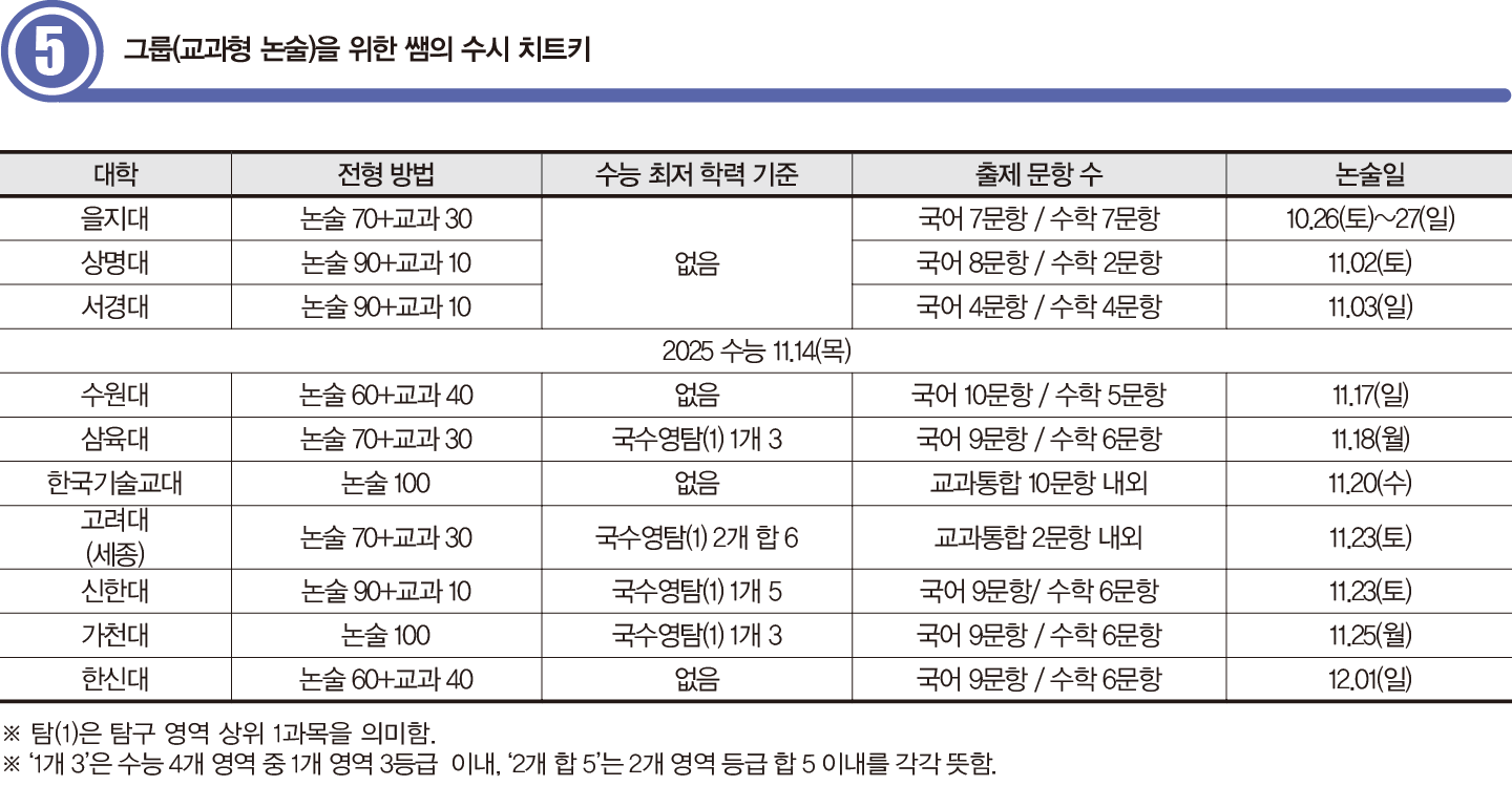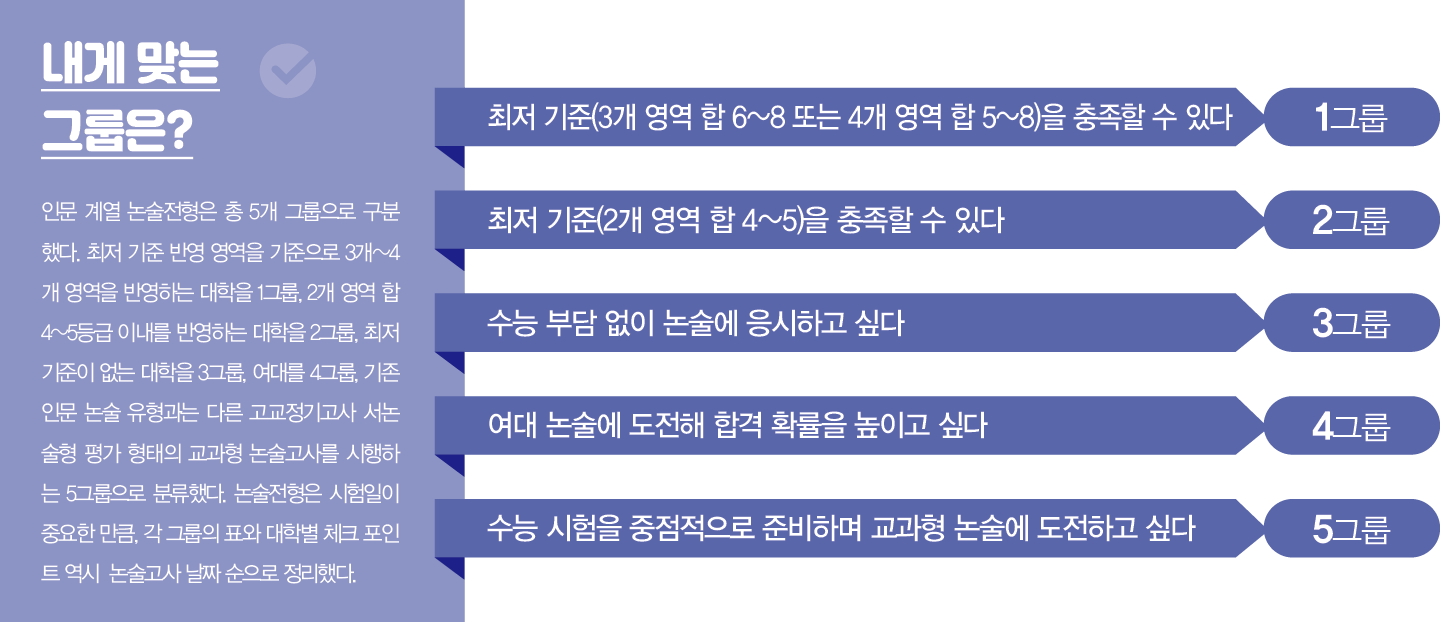5그룹 대학의 인문 계열 논술전형은 언어논술의 유형이 아닌 고등학교 정기고사 서술·논술형 문항 형태와 난도로 출제되는 교과형 논술로 진행된다. 대부분 대학이 국어와 수학 문제를 함께 출제한다. EBS 수능 연계 교재를 직접 활용하거나 연계 교재 수준의 지문이나 문제를 제시하는 경우도 많다. 즉, 수능과 함께 준비할 수 있다.