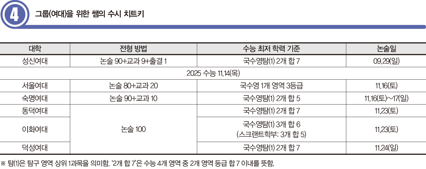 여대 논술전형은 상대적으로 경쟁률이 낮다. 모두 최저 기준이 있어, 최저 기준을 통과하면 합격 확률이 높아진다. 경쟁률은 대학마다 달라 성신여대 30:1, 덕성여대 64:1, 동덕여대 25:1, 서울여대 20:1 내외다. 동덕여대와 서울여대의 실질 경쟁률은 10:1 내외로 발표됐다.
