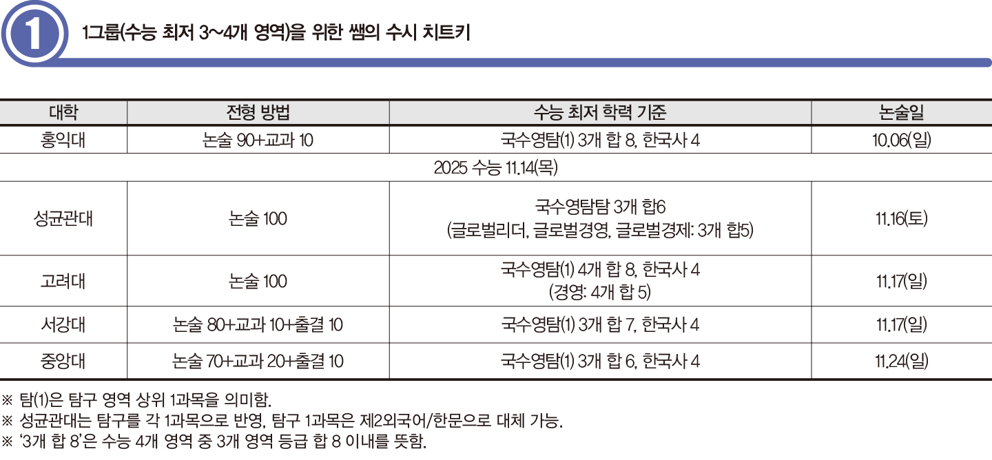 1그룹 대학은 최저 기준 반영 영역이 4개 또는 3개로 높은 수준이다. 이 때문에 지원 시 경쟁률과 최저 기준 충족 및 충원까지 고려한 실질 경쟁률의 차이가 크다. 예를 들어 서강대 인문 계열은 모든 모집 단위의 경쟁률이 90:1을 넘었지만, 실질 경쟁률은 평균 20대 후반에 형성됐다. 중앙대도 역시 최초 경쟁률은 약 60~100:1 사이로 집계됐지만, 실질 경쟁률은 약 13~28:1로 나타났다. 즉, 최저 기준 충족이 큰 변수로 작용하는 그룹이다. 따라서 6, 9월 모의평가 성적이 희망 대학의 최저 기준을 충족하는지 확인한 후 지원을 고려해야 한다.