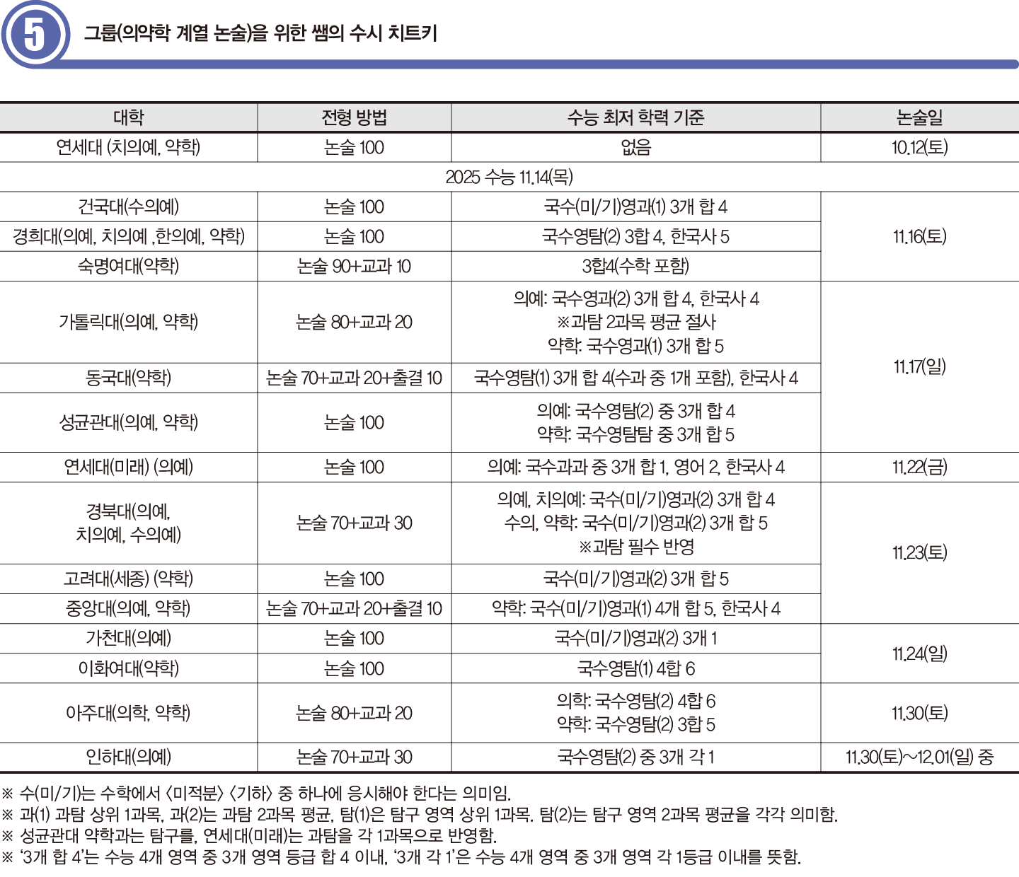 의약학 계열에 대한 선호도가 갈수록 높아지는 만큼 5그룹 논술전형은 매년 가장 높은 경쟁률을 보인다. 연세대를 제외한 모든 대학이 수능 이후 논술고사를 실시한다. 최저 기준이 상당히 높지만 최상위권 수험생이 밀집하는 만큼 충족률이 상당하다. 논술고사도 지원자층의 특성상 변별을 위해 시험이 매우 어렵게 출제된다. 합격 점수 또한 높으므로 지원 시 본인이 해결 가능한 문제가 출제되는지 반드시 확인해야 한다.