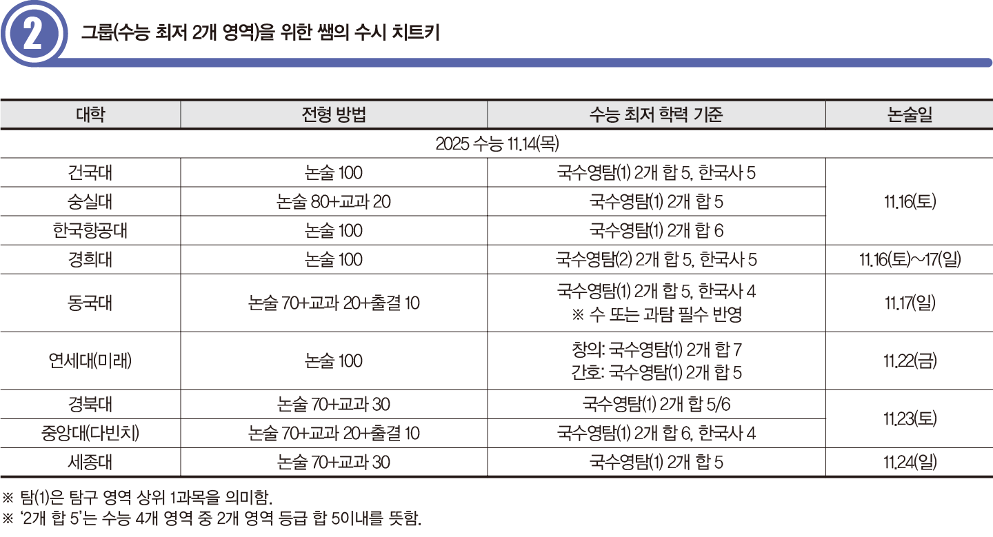 2그룹 대학은 최저 기준에 2개 영역을 반영하며, 모두 수능 이후 주말에 논술고사를 실시한다. 이 그룹 대학의 수리 논술 문제는 2~3개의 대문항에 1~4개의 소문항으로 구성된다. 단, 대학별 난도 차가 크다. 반드시 실제 대학의 기출문제 유형을 살펴보고, 본인에게 맞는 대학을 선택해야 한다.