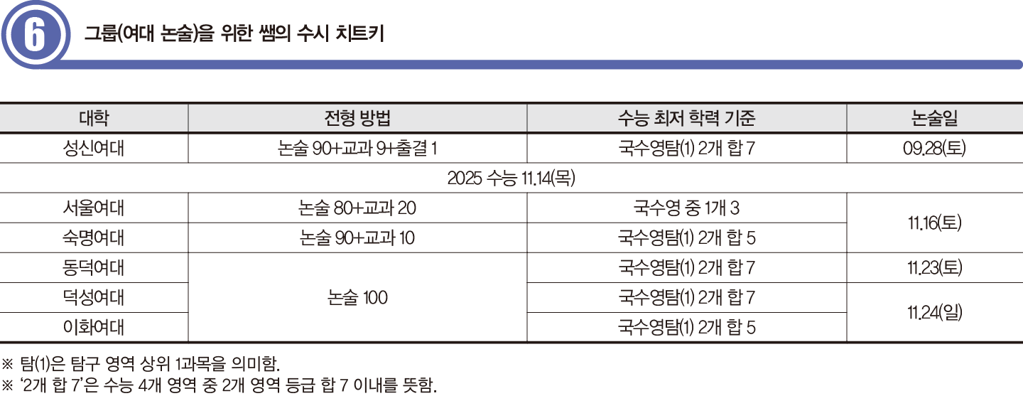 여대 논술전형은 상대적으로 경쟁률이 낮다. 모두 최저 기준이 있어, 최저 기준을 통과하면 합격 확률이 높아진다. 또한 문제 출제 경향이 일관되고 문제의 난도도 평이하다. 기출문제를 집중적으로 연습한다면 좋은 결과가 기대된다.
