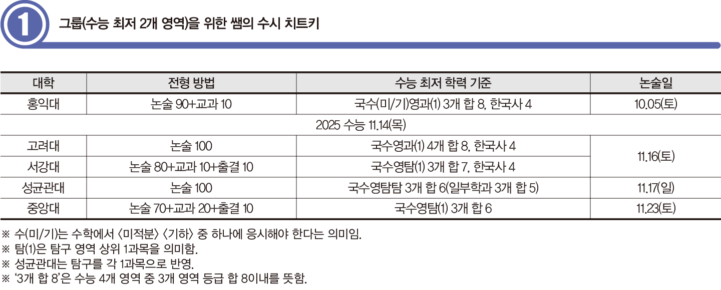 1그룹 대학은 학생 선호도가 높은 만큼 경쟁률도 상당히 높지만 최저 기준을 고려한 실질 경쟁률은 크게 감소한다. 예를 들어 2024학년 서강대의 논술전형의 최초 경쟁률은 138.03:1을 기록했으나 입학처가 밝힌 실질 경쟁률은 43.87:1이었다. 따라서 6, 9월 모의평가 성적이 희망 대학의 최저 기준을 충족하는지 확인한 후 지원을 고려해야 한다.