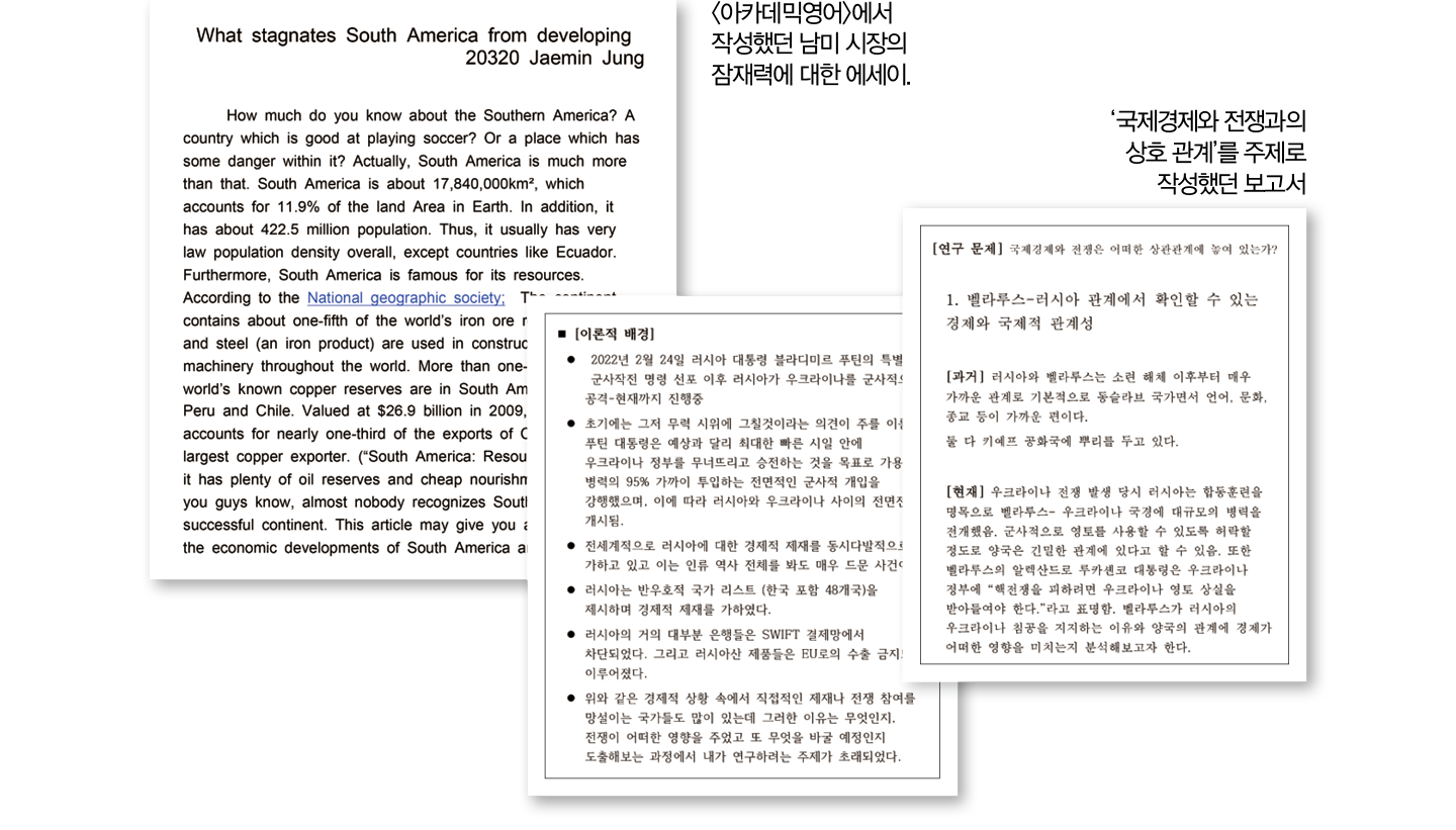 “일반고와는 차별화된 외국어 과목이 많았어요. <아카데믹영어>는 다양한 주제로 에세이를 작성하고 발표하는 수업이었어요. 국제경제에 관심이 많았던 만큼 남미 경제의 문제점과 해결 방안을 주제로 작성하고 발표했죠. 선생님께서 첨삭도 해주셔서 영어 실력 향상에 도움이 많이 됐어요. 에세이를 써가는 과정이 재미있기도 했고요.”