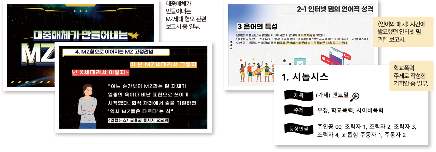 “학교폭력을 주제로 시놉시스를 작성하고 영화, 드라마, 뮤지컬 등으로 구현할 때의 차이점을 고민했어요. 영화 예술 창체 활동에서는 영화의 제작 과정과 이야기의 기본 원리를 배우고 습작을 거쳐 짧은 영상을 만들었죠. 새로운 결과물을 창조할 때의 성취감이 정말 크더라고요.”