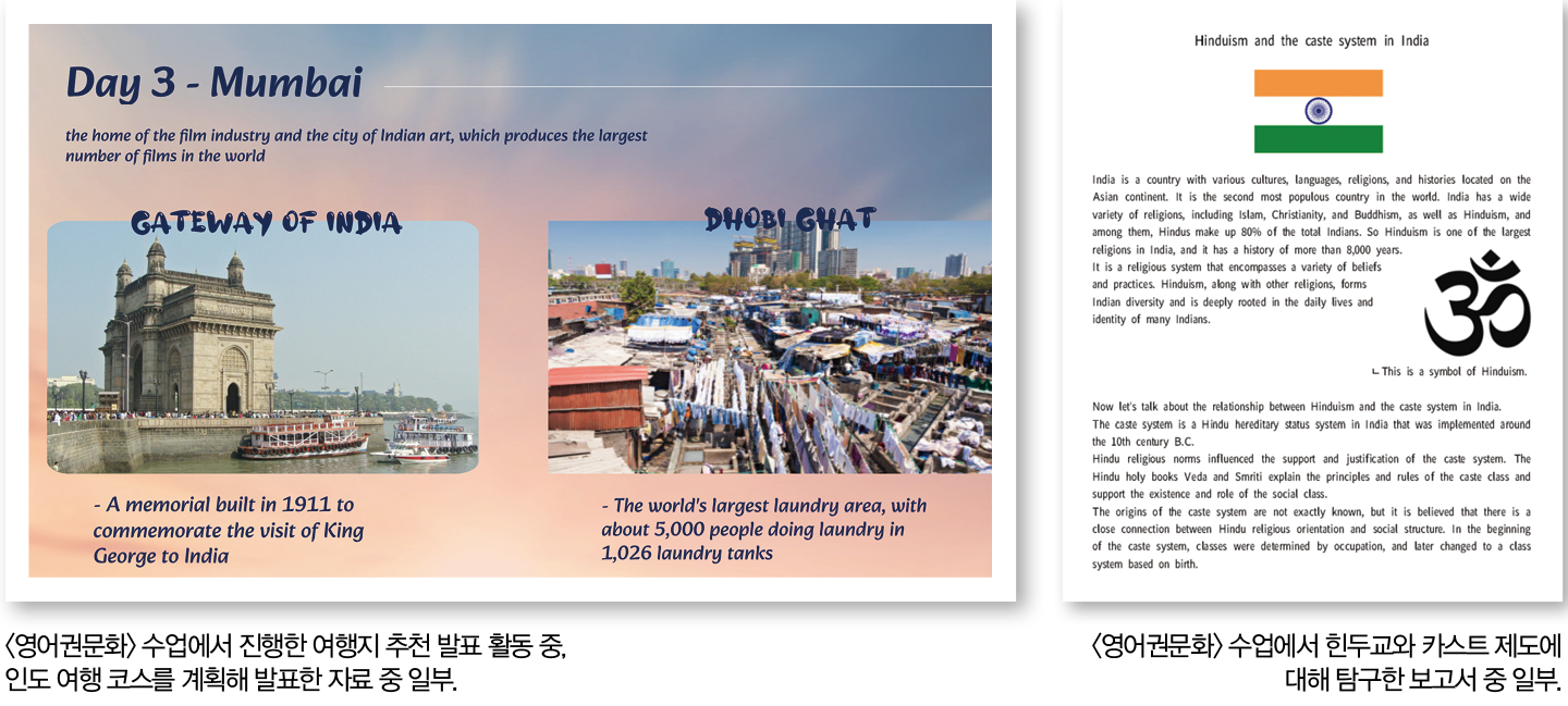 <영어독해와 작문> 인도 저작권청이 세계 최초로 인공지능 페인팅 앱에 공동 저작자 지위를 인정한 것을 비롯해, 세계 여러 나라에서 AI 관련 저작권법 논의가 활발히 이뤄지고 있음을 조사함 <영어권문화> 여행지 추천 글쓰기 활동을 통해 인도의 관광 명소, 음식, 화폐, 종교 등을 영문으로 작성하고 여행 코스를 계획해 발표함 <중국문화> ‘중국과 인도의 인구 문제’라는 주제로 두 나라의 사회, 정책, 경제적 측면을 비교·분석함