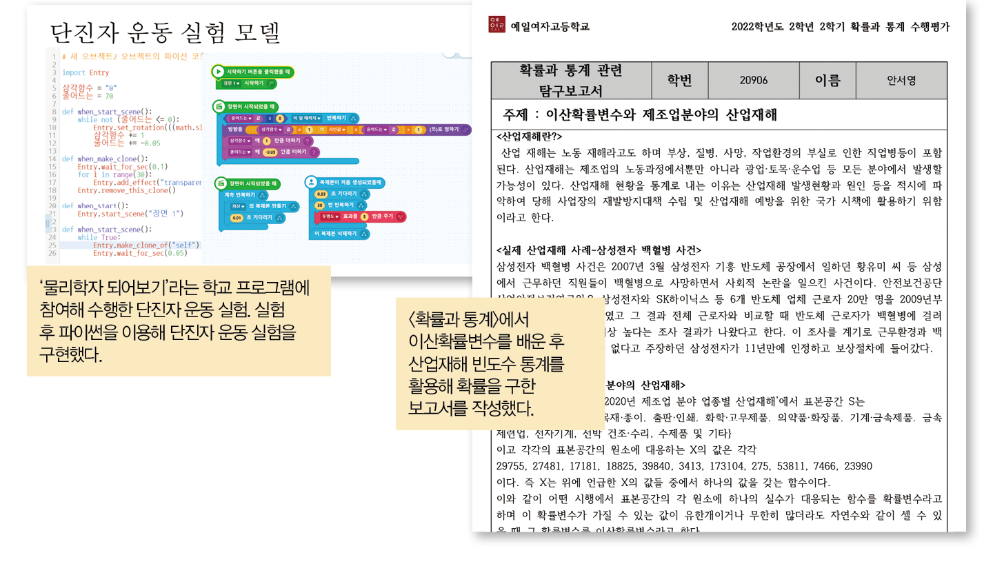 <수학Ⅱ> ‘로켓의 회전 운동과 미분’을 주제로 탐구 보고서를 작성 <확률과 통계> 이산확률변수를 배운 후 산업재해 빈도수 통계를 활용해 확률을 구하고 표로 나타냄 <영어Ⅱ> 머신러닝을 통해 화학기호를 익힌 인공지능을 신소재 개발에 활용해 비효율적이고 노동 집약적인 기존 방식에서 벗어날 수 있음을 영어로 발표 <기하> ‘가상현실과 공간좌표’라는 보고서를 통해 가상현실을 구현하기 위한 장치 속 기울기 센서의 상호작용이 공간벡터를 만들어 움직임을 감지한다는 것을 밝힘