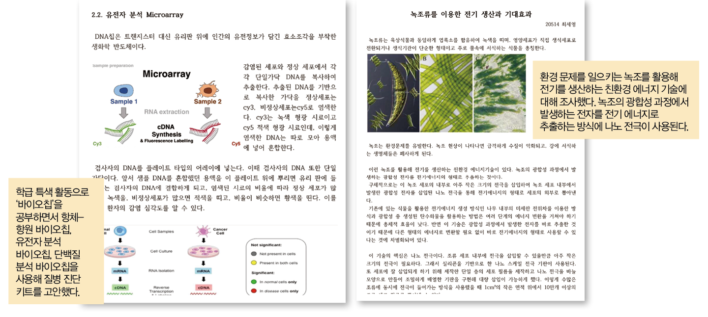학급 특색 활동으로 진로가 비슷한 친구와 함께 바이오칩도 탐구했다. 독서 토론에서 시작된 탐구였다. <나노 바이오 테크놀로지>를 읽고 바이오칩에 흥미를 느낀 친구가 모임을 만들었다. 바이오칩은 트랜지스터 대신 유리판 위에 인간의 유전 정보가 담긴 효소 조각을 부착한 생화학 반도체다. 바이오칩은 생명·물리 내용을 포함해 진로가 다른 친구와 함께 탐구하기 좋은 소재라고 생각했다.