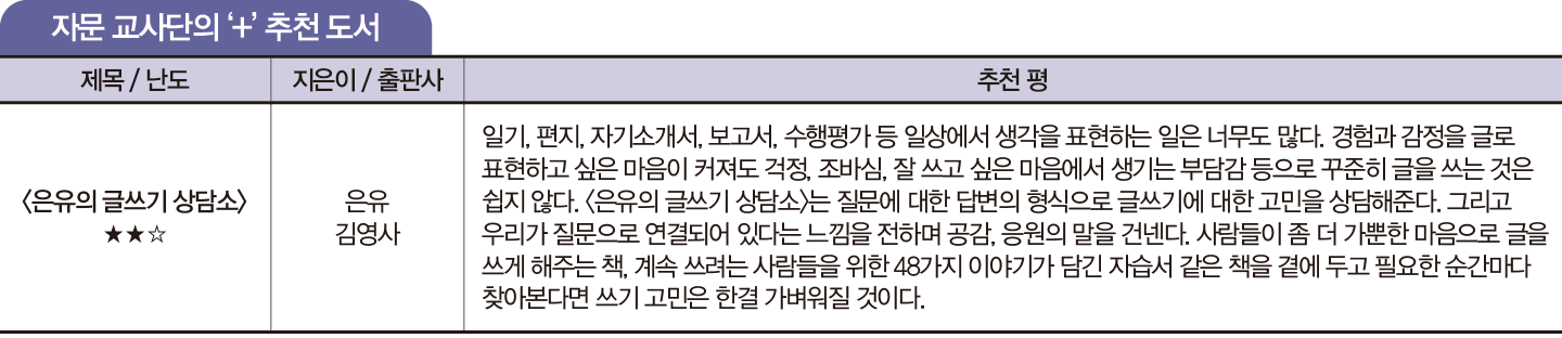 고교 국어 수업에서 서평 쓰기는 단골 수행평가 과제다. 뿐만 아니다. 다른 교과나 대학에서도 비슷한 과제가 나온다. 왜 가르치는 이는 배우는 이에게 서평을 쓰게 할까? 자문 교사단은 그 답으로 ‘읽고 이해하고 쓰기를 한꺼번에 다루며 공부와 글쓰기를 모두 잡을 수 있는 활동’이기 때문이라고 설명한다. 문제는 어떻게 읽고 써야 할지, 학생들이 헤맨다는 데 있다.