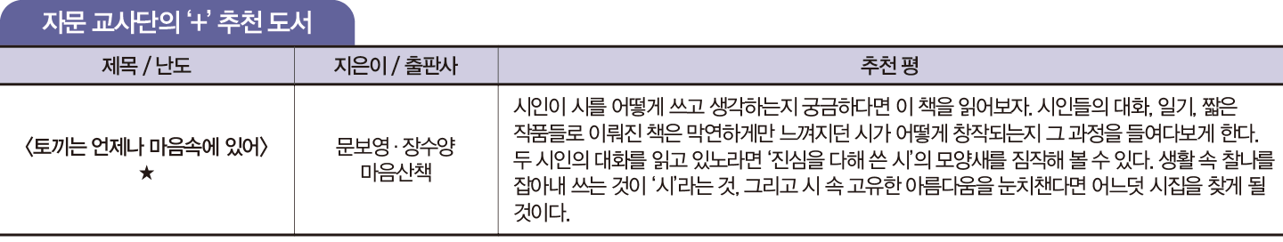 안타깝게도 청소년은 문학을 그저 공부거리로만 여기는 편이다. 누군가 대신 요약한 줄거리와 의미, 작가의 생애, 시대적 배경을 외울 뿐, 작품은 읽지 않는다. 국어 교사 자문단은 “문학 자체로 수용하고, 그 안에서 삶을 발견하는 것이 진정한 의미의 문학 공부”라고 강조한다. 문학 작품을 읽는 일은 질문을 만들어가는 과정이고, 그 답을 삶 속에서 발견해가는 일이다. 이 책을 읽으며 문제 풀이가 아닌 진정한 의미의 공부를 즐겁게 시작해보길 바란다.