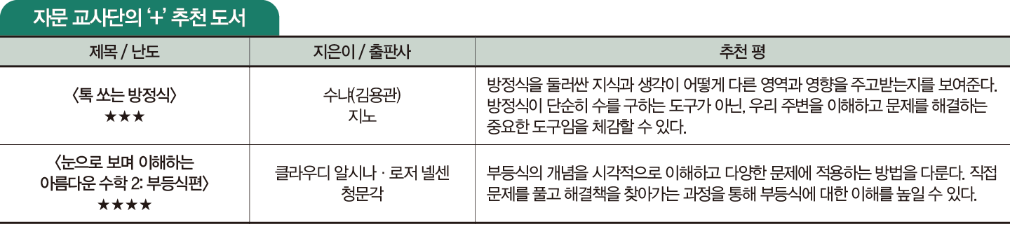 “수학에서 문자와 식은 수량 관계를 명확하고 간결하게 표현하 는 중요한 도구입니다. 문자를 사용해 수량 관계를 일반화하고, 사칙 연산을 다항식에 확장해 적용하는 것이 핵심이죠. 단순히 계산 도구를 넘어 수학의 여러 분야를 학습하는 기반이자, 논리 적 사고력과 문제 해결 능력을 길러주는 데 중요한 역할을 합니 다. <세계를 바꾼 17가지 방정식>은 방정식의 역사, 관련 수학자 들의 일화, 실제 생활에서의 활용뿐만 아니라 방정식을 이해하는 데 꼭 필요한 개념과 원리를 모두 설명합니다. 전체적인 맥락 속 에서 방정식의 의미와 중요성, 실생활에서의 다양한 활용 사례를 살펴보며 방정식과 부등식을 깊이 이해해봅시다.”_ 자문 교사단
