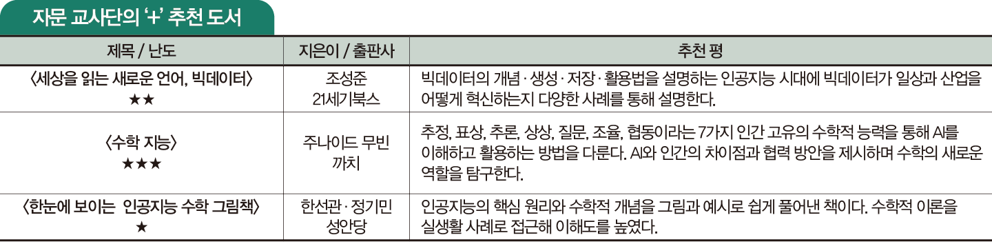 “수학은 예측 불가능한 시대를 살아가는 우리에게 필수적인 도구입니다. 이 책은 예측과 분석의 기본 원리를 탐구하고 현대 사회에서 필수적인 인공지능, 빅데이터, 확률, 통계, 수학적 모델링 등을 흥미롭게 풀어냅니다. 그러면서 수학이 단순한 계산을 넘어 불확실성을 관리하고 예측을 개선하며 복잡한 세상을 이해하는 데 중요한 역할을 한다는 점을 알려주죠. 수학이 실제 생활과 얼마나 밀접하게 연결돼 있는지, 또한 어떻게 복잡한 세상을 해석해내는지 보여주는, 재미와 유용성을 모두 갖춘 교양서입니다. 이 책을 읽으며 수학과 친밀해지는 시간을 가져보길 추천합니다.”_ 자문 교사단