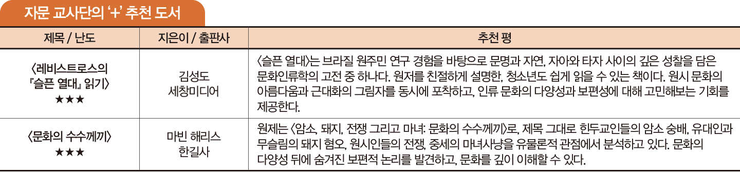 “문화인류학은 <사회·문화> 교과에서 중요하게 다루는 분야입니다. 이 책은 경제학에서 <국부론>의 지위에 버금가는, 문화인류학의 바이블이라 할 수 있어요. ‘문화의 상대성’ ‘문화와 개인의 상호 의존적 관계’와 같은 개념은 이제는 상식으로 통하지만 19세기 전 까진 그야말로 ‘듣보잡’ 신학문이었거든요. 이 책의 등장으로 객관적 자료를 바탕으로 한 연구와 분석의 기틀이 마련돼 문화인류학이 사회과학의 주요 분야로 우뚝 설 수 있었죠. 수업 시간에 배운 ‘문화’가 너무 간단명료해 실망스러웠다면 꼭 한 번 읽어보세요. 그 단순한 개념이 얼마나 고된 학문적 연구 과정을 거쳐 완성된 결과물인지 알면 놀랄 겁니다.”_ 자문 교사단