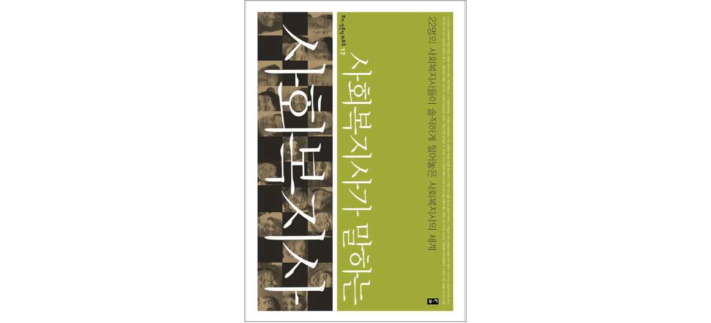 22명의 사회복지사가 직접 사회복지에 대해 풀어낸 책이에요. 아동복지, 장애인복지, 국회협동조합, 국 제구호단체 등 다양한 현장에서 활약하며 느낀 감정 과 현실적인 어려움을 생생하게 담아냈어요.
