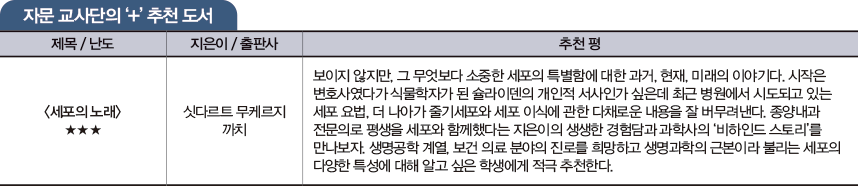 “세포는 초·중·고를 거치며 반복적으로 만난, 우리에게 친숙한 생명과학 분야죠. 이 책은 세포에 관한 지식이 어떻게 발견되고 확립됐는지 알려주는 ‘세포 연구의 연대기’라고 할 수 있습니다. 현미경과 염색법 발달 과정부터 폐렴균을 이용한 형질전환 실험, 모건의 초파리 연구, 원심분리를 이용한 연구 등 교과서 속 내용뿐만 아니라 세포 아틀라스 프로젝트에 의한 세포 분류, 헬라세포와 세포 수명, 암세포의 필라델피아 염색체, 줄기세포, 오가노이드 등 깊이 있는 이야기도 해줍니다. 생명 현상의 원리와 본질을 탐구해보고 싶거나 생명과학 연구에 종사하고픈 꿈이 있다면 즉시 책장을 펼쳐보세요. 한층 발전된 자신을 만날 수 있을 겁니다.”_ 자문 교사단