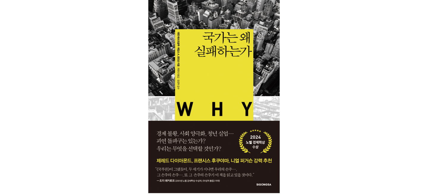 올해 노벨 경제학상 수상자들의 대표 저서입니다. 정치 제도가 경제 제도에 영향을 미친다고 주장하며 다양한 사 례로 이를 설명해요. 책이 두껍고 읽기 도 다소 어렵지만, 몇 가지 사례를 발췌해 보는 것만으로도 의미가 있어요. 이 책에 쓰인 연구 방법은 <사회·문화>에서 접한 것이고, 이론은 윤리 교과와 관련 깊어요. 경제 불황 원인에 주목한다면 <경제>, 착취적 정치 제도에 대한 고 발이 흥미롭다면 <정치와 법>, 시대에 따른 국가 제도의 발전과 실 패는 <세계사>와 연결해 탐구해볼 수 있고요. 이런 시야를 안겨준 책이라 제게 의미 있어요. 인문 계열 지망생은 물론 사회 문제에 흥 미가 있는 누구나 꼭 한 번 읽어보길 추천합니다.