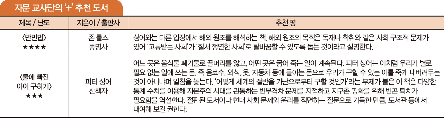 “등굣길 분수대에 한 어린아이가 빠져 허우적거리는 모습을 발견한다면 어떻게 하실 건가요? 주변엔 사람이 없어 내가 돕지 않으면 아이는 죽을 수 있습니다. 분수대는 높지 않지만 신발과 교복은 젖을 수밖에 없고, 지각도 불가피하죠. 실천윤리학 분야의 거장이자 동물해방론자인 피터 싱어는 이런 상황을 제시하며, 집단의 실천적 도덕성을 강조해왔습니다. 싱어의 이론적 단초가 담긴 이 책은 우리가 끊임없이 접하는 현대 사회의 윤리적 이슈를 다뤄 흥미롭습니다. 시대 변화에 맞춰 기후변화 파트가 추가된 점도 눈여겨볼 만합니다. 절대 빈곤에 빠진 사람을 돕는 등, 사회가 약자를 지원해야 하는 이유를 이 책으로 알아보세요.”_ 자문 교사단