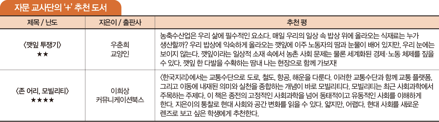 “조선소에서 5년간 근무한 지은이의 생생한 이야기가 담긴 책입니다. 경남 거제라는 공간적 배경과 함께 조선소 노동자와 그 가족의 진짜 이야기를 만나볼 수 있죠. 찬란했던 시절을 뒤로하고 떠나는 사람과 남은 사람의 삶을 조명하며 위기의 본질을 깊이 고민해볼 수 있고요. 진정한 가족의 의미는 무엇이고, 그 가족의 범위는 무엇인지도 돌아보게 됩니다. 책을 읽다 보면 단순히 ‘공장이 도시에 있다’는 사실을 넘어서, 공장에서 일하는 ‘사람’에 관심을 갖게 됩니다. 후속작인 <울산 디스토피아, 제조업 강국의 미래> 또한 우리나라 최대의 중화학 공업 도시인 울산의 과거, 현재, 미래를 조명해요. 두 권을 함께 읽는다면  <한국지리>의 공업 단원을 깊이 학습할 수 있을 겁니다.”_ 자문 교사단