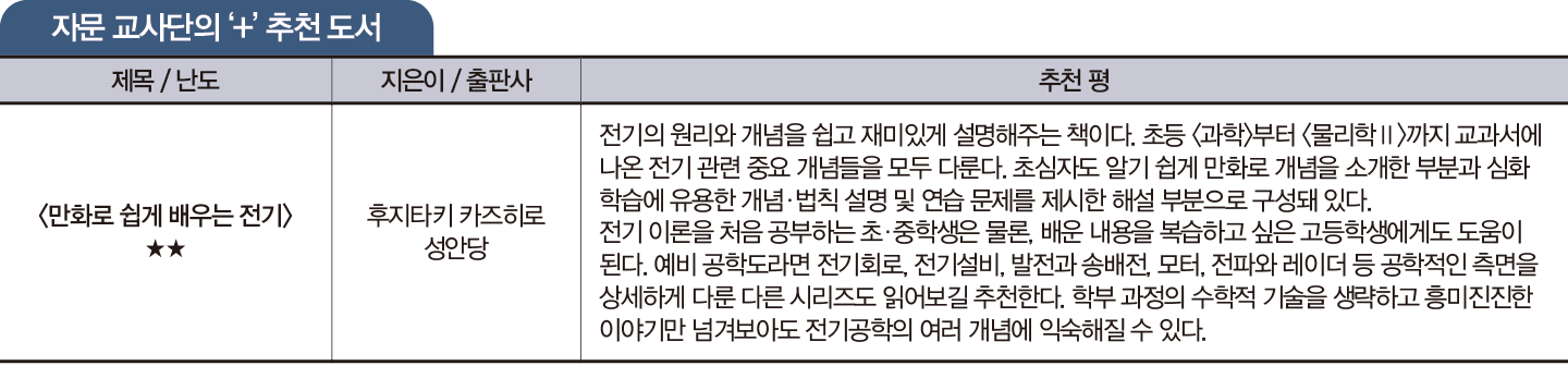 유튜브나 게임 없는 삶을 두려워하면서 전기는 어려워하는 학생이라면 ‘전기(電氣)의 전기(傳記)’인 이 책으로 가까워지자. 다양한 소재를 다루고 있어, 흥미로운 부분은 최근 상황을 조사하는 등의 탐구 활동으로 이어가보는 것도 추천한다.