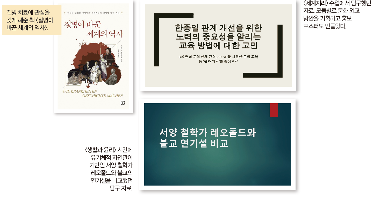 <생활과 윤리> 유기체적 자연관이 기반인 서양 철학 사상가 레오폴드와 불교의 연기설을 상호 비교 <세계지리> 교육에 대한 관심으로 ‘한·중·일 관계 개선을 위한 노력의 중요성을 알리는 교육 방법에 대한 고민’을 주제로 탐구 <논술> 약탈 문화재 반환 문제를 해결하기 위해 정부는 국제 사법 기구에 제소하고 시민 역시 책임감으로 연대해야 한다고 서술