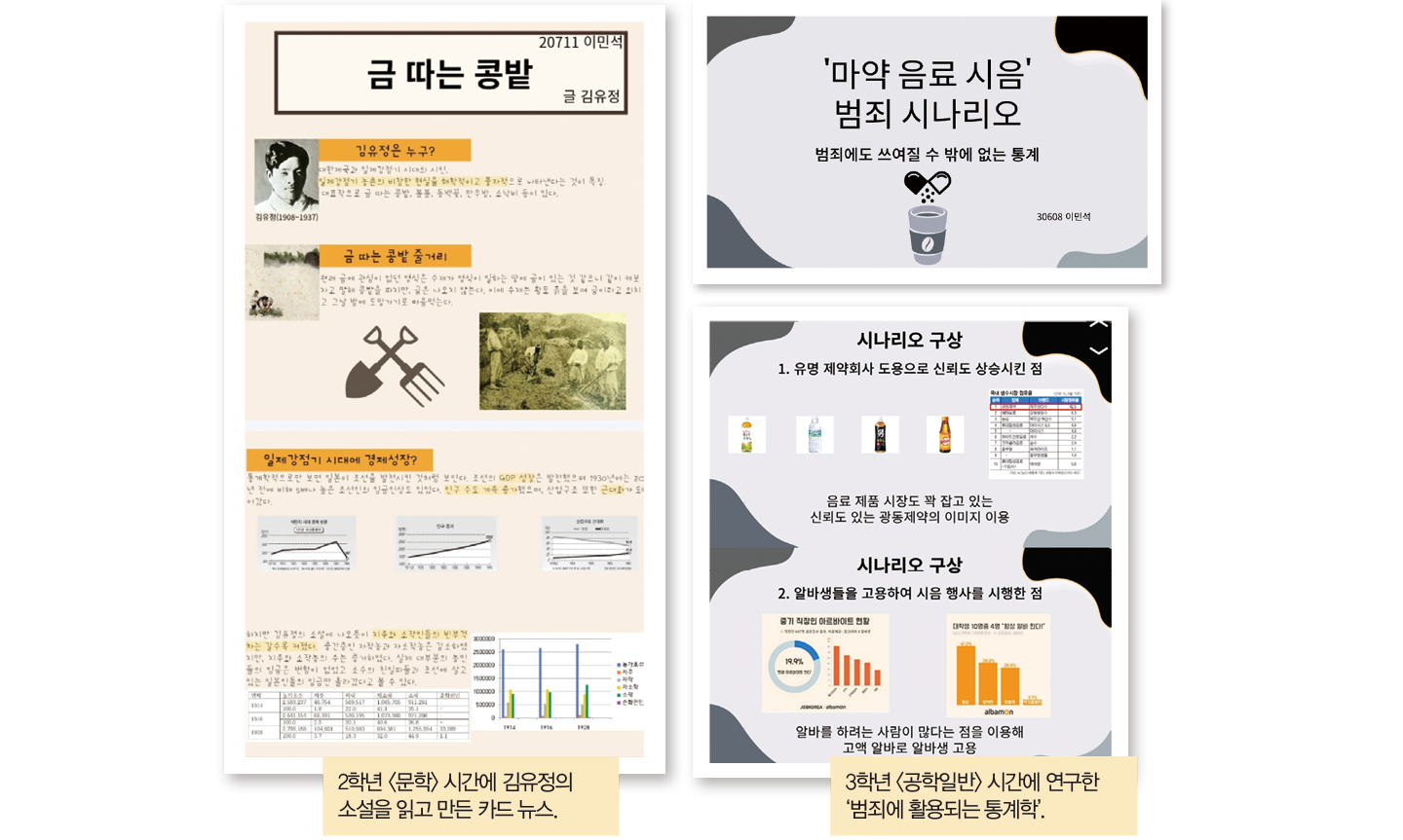 <문학> 김유정의 <금 따는 콩밭>을 읽고 당시의 농가 호수, 지주와 자작, 자소작, 소작인의 수, 임금 상승에 대한 통계 자료를 찾아 객관적으로 분석하여 그래프로 나타낸 카드 뉴스를 완성함 <화학Ⅰ> 인공지능으로 온실가스인 메테인을 유용한 화학 원료로 바꾸는 실험이 기존보다 수율을 10% 이상 높이는 데 성공한 사례를 소개하고 통계가 기반인 인공지능 활용의 중요성을 역설함