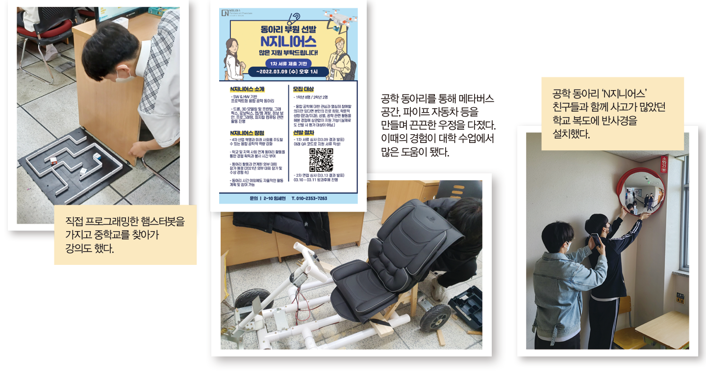 학교에서 마련해준 드론으로 동아리 친구들과 작게나마 드론 쇼도 했다. 교육용 드론이라 사양이 뛰어나지 않아 섬세한 쇼를 기획하기는 어려웠지만 드론 쇼가 이뤄지는 방식을 조금이나마 맛볼 수 있었다. 코딩을 공부해 동아리 친구들과 햄스터봇을 만들어 부원 중 한 명의 모교인 중학교를 찾아가 강의했던 일도 빼놓을 수 없다. 모두 공학에 대한 열정으로 똘똘 뭉친 또래가 있었기에 가능했다.