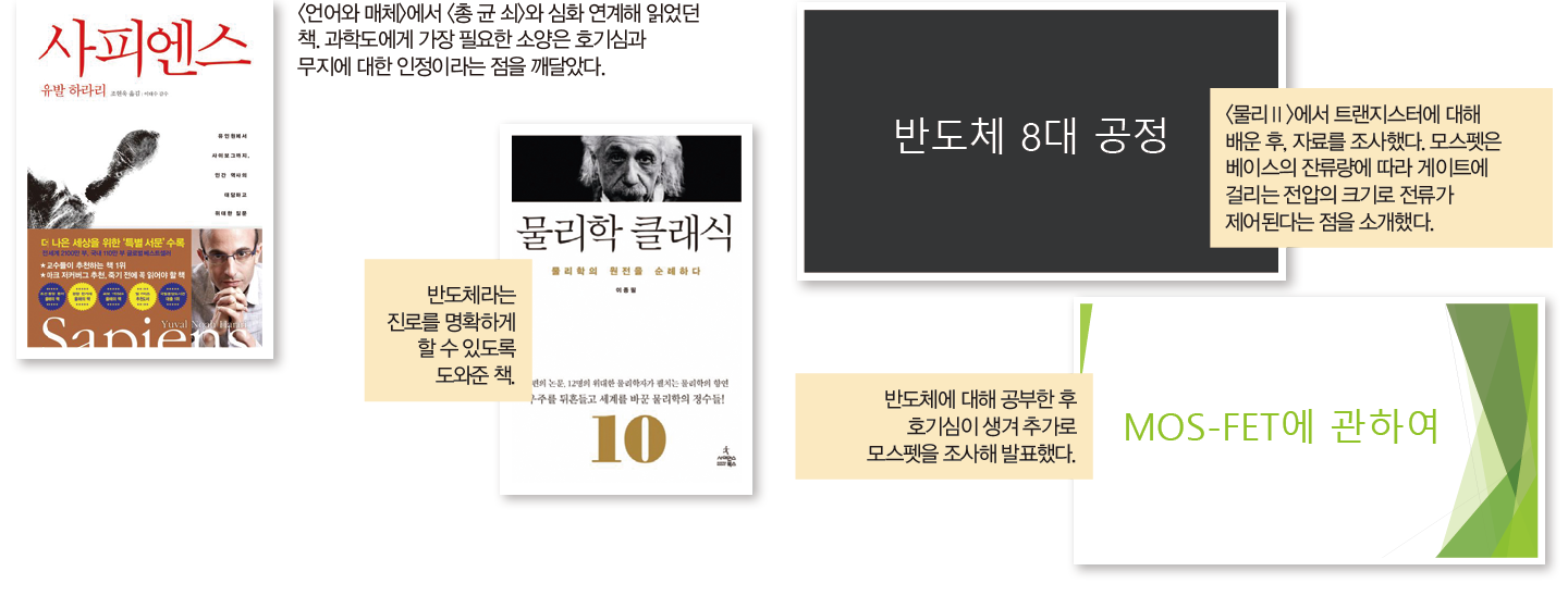 “트랜지스터도 종류가 다양한데 그중에서 모스펫이라 불리는 금속 산화막 반도체 전계효과 트랜지스터(MOS-FET)를 알게 됐어요. 반도체와도 떼려야 뗄 수 없는 관계고요. 열심히 책과 논문을 찾아 조사한 끝에 모스펫은 베이스의 전류량에 따라 컬렉터의 전류량이 제어되는 게 아니라 게이트에 걸리는 전압 때문이라고 발표했어요. 앞으로 모스펫이 어떤 형태로 발전할지 궁금해서 파고들었는데 이 정도로 탐구하는 친구는 없더라고요. (웃음) 아마 누가 시켜서 했다면 이렇게 열심히 하진 못했을 거예요. 지금도 학술 동아리에서 친구들에게 열심히 공부하라고 채찍질하고 있어요. 하하.”