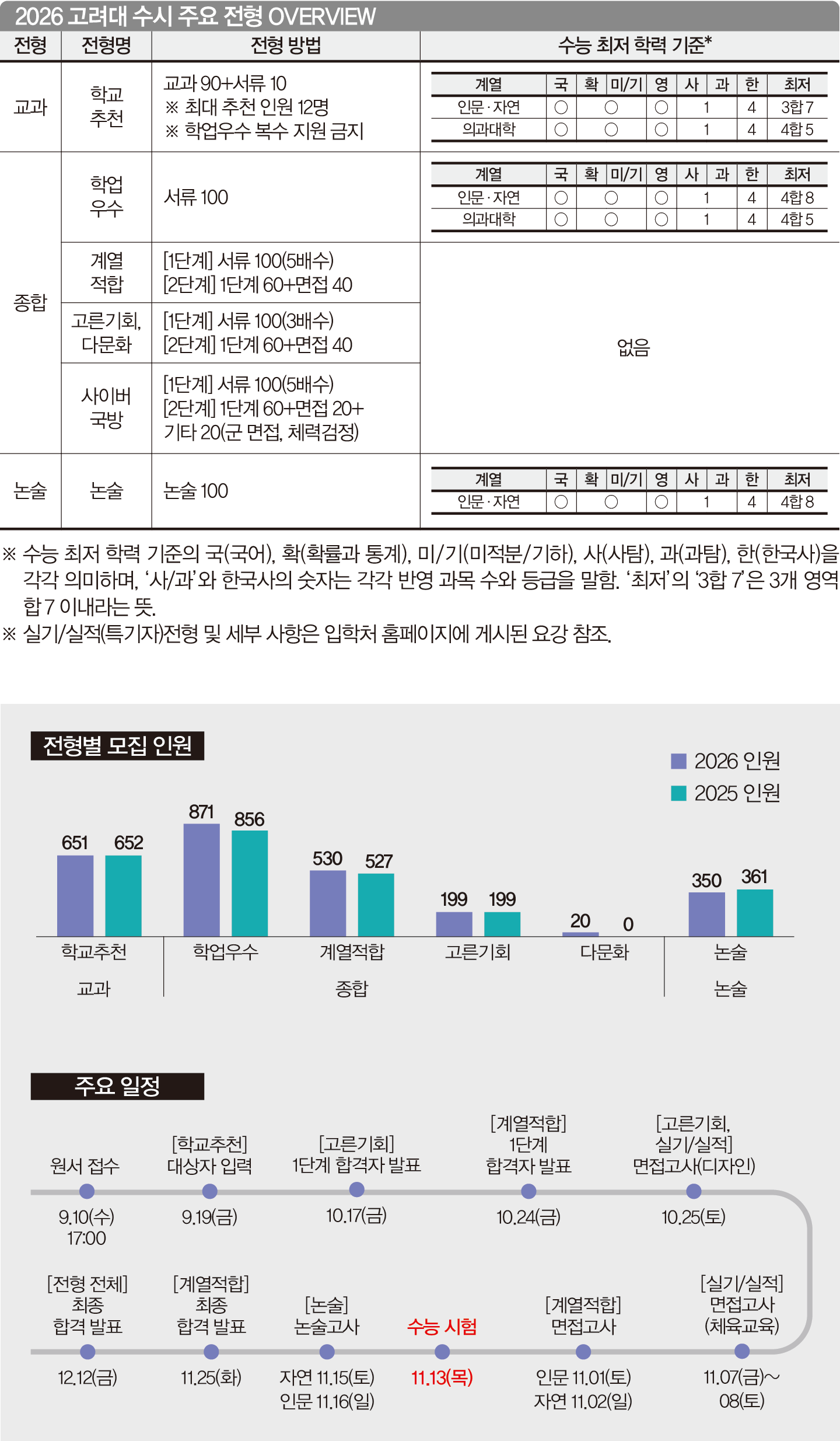 고려대 2026학년 수시는 다양한 변화가 있다. 우선 전형별 평가 방법이 달라졌다. 학생부교과 학교추천전형의 서류 반영 비중이 20%에서 10%로 줄어든 한편, 학생부종합 계열적합전형의 면접 비중도 50%에서 40%로 감소했다. 수능 최저 학력 기준도 변화가 있다. 최저 기준에서 필수 탐구 응시 과목이 폐지되면서 사회탐구 응시자도 자연 계열 지원이 가능해졌다. 학업우수전형의 반도체공학과 차세대통신학과 스마트모빌리티학부, 논술전형의 경영대학은 최저 기준이 완화됐고, 사이버국방전형의 최저 기준이 폐지됐다. 정시에서만 모집했던 학부대학이 수시에서도 16명을 선발한다는 점도 눈에 띈다. 고려대 입학처 정안나 책임입학사정관에게 2026 수시에서 주목할 점을 들었다.