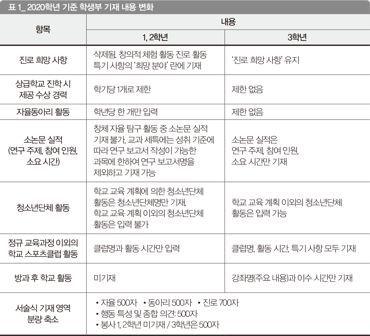 2020학년 기준 학생부 기재 내용 변화를 정리해보면 진로 희망 사항은 삭제됐고, 수상 실적은 한 학기에 한 개만 대학 측에 제공할 수 있다(표 1). 자율동아리 활동은 동아리명과 간단한 소개글 한 줄 정도만 학년당 한 개 입력이 가능해졌다. 방과 후 학교 활동은 기재할 수 없고, 봉사 활동 관련 세부 사항도 서술식으로 기재할 수 없다. 행동 특성 및 종합 의견의 글자 수는 500자로 대폭 축소됐다. 이와 더불어 자격증 관련 내용도 대학 측에 일체 제공할 수 없다.