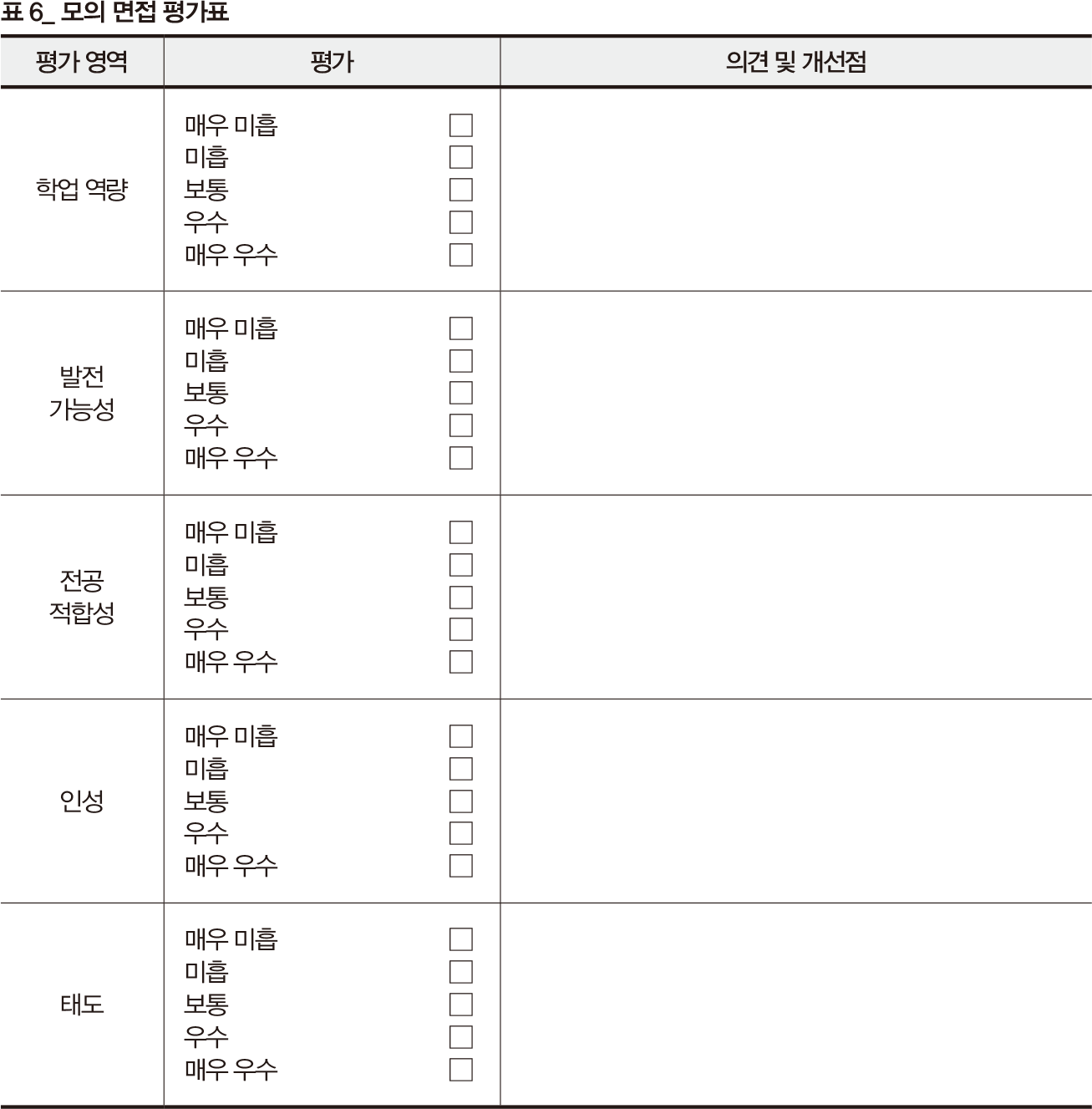 동영상을 다시 돌려보며 선생님들이 서류의 어떤 부분에서 질문했는지 다시 한 번 복기하는 것도 필요하다. 최근 5~6년간 학생들의 모의 면접을 진행하면서 느낀 점은 ‘결국 중요하다고 인식하는 지점은 보편적’이라는 것이다. 교사는 학생부를 작성하는 주체이기 때문에 어떤 서술이 중요하고, 어느 대목이 이 학생의 특성을 가장 잘 드러내는지 쉽게 파악할 수 있다. 선생님들이 질문한 내용은 따로 표시해 특히 신경 써서 봐야 한다. 이때 ‘표 6’과 같은 표를 모의 면접관에게 미리 제공한 뒤 모의 면접 전반에 대한 의견과 개선점을 작성해달라고 부탁하는 것도 좋다.