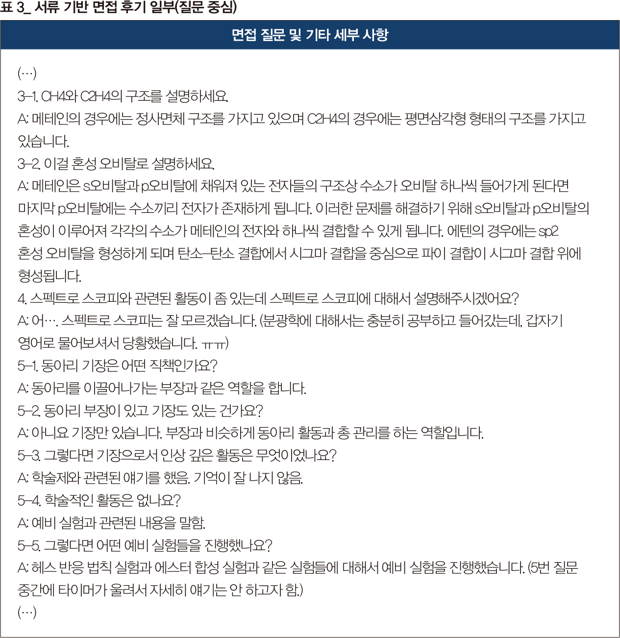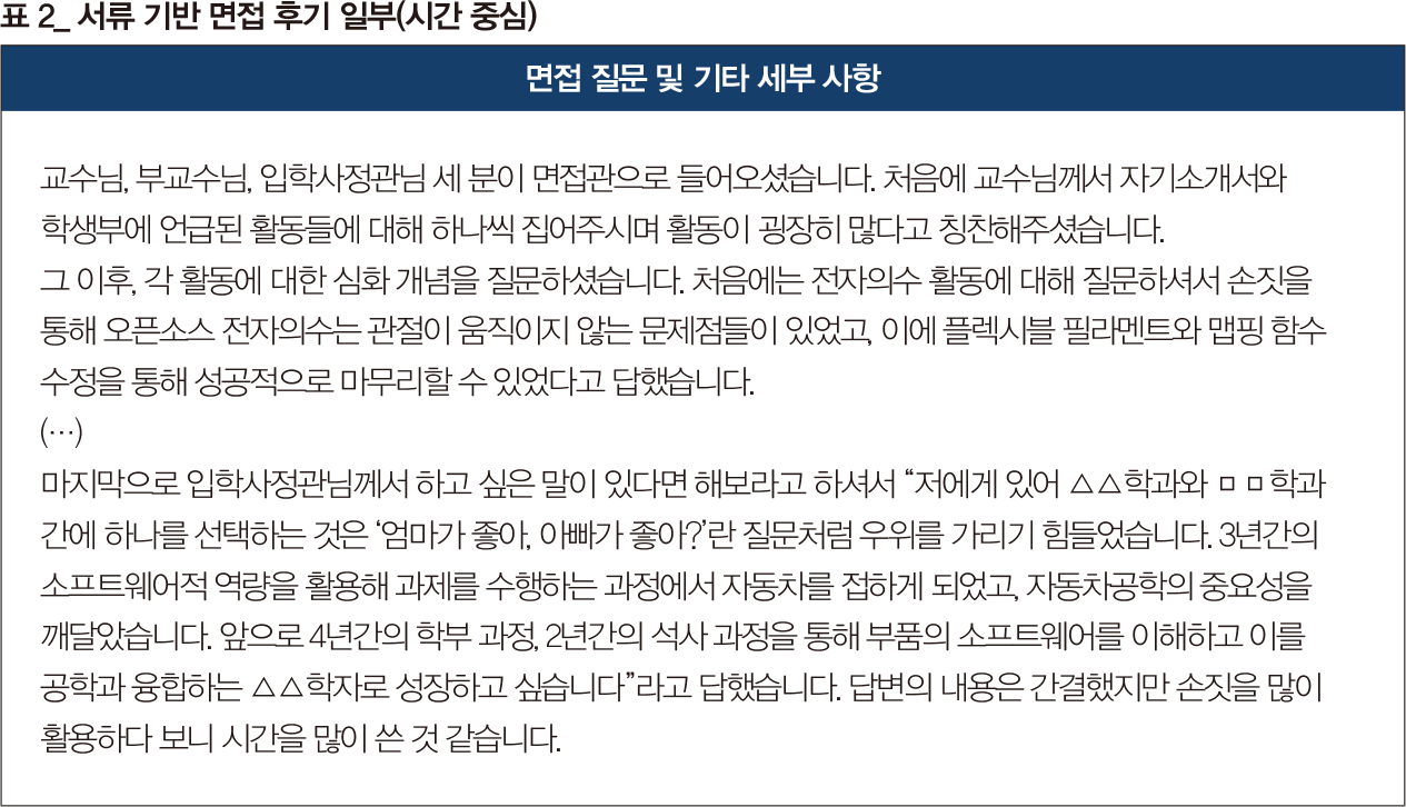 면접 후기는 ‘표 2’와 ‘표 3’과 같이 두 가지 버전을 함께 참고하는 것이 가장 이상적이다. ‘표 2’는 면접실의 상황을 시간 중심으로 서술한 내용이다. 아직 면접을 경험하지 못한 학생들은 ‘표 2’를 참고해 대략적인 면접실 분위기를 미리 머릿속으로 시뮬레이션해보면 좋을 것이다. ‘표 3’은 서류 기반 면접 시 받았던 질문을 중심으로 서술한 내용이다. 실제 면접 전 모의 면접 문항을 스스로 개발해 준비하는 데 도움을 받을 수 있는 자료다. 특히 ‘표 3’을 참고해 꼬리 질문이 나오는 상황을 상상하며 면접을 대비하면 좋다.