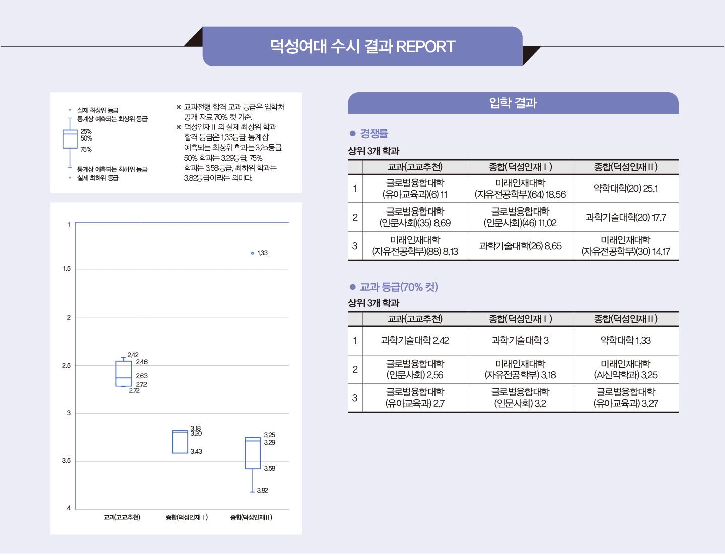 종합전형의 2025학년 70% 컷을 보면 덕성인재Ⅰ은 3.18~3.42등급, 덕성인재Ⅱ는 1.33~3.82등급 사이에 합격선이 형성됐다. 서류 100%로 선발하는 덕성인재Ⅰ에 비해 2단계에서 면접 40%를 반영하는 덕성인재Ⅱ의 합격선 범위가 넓다는 점에서 면접이 합격에 영향을 미치고 있음을 알 수 있다.