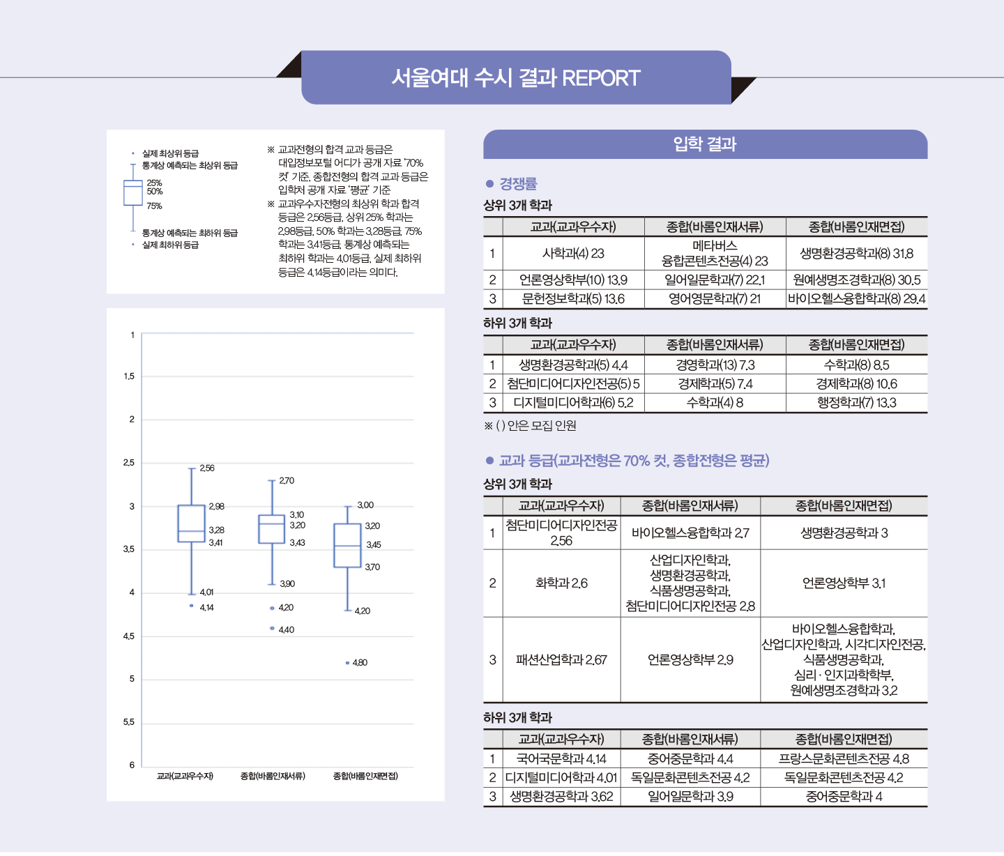 면접전형은 면접의 반영 비율이 50%로 높고 1단계에서 5배수를 선발하는 만큼, 교과 성적이 상대적으로 약한 학생들도 해당 학과에 대한 준비가 잘돼 있다면 도전할 만하다. 합격선은 서류전형이 면접전형에 비해 높게 형성되지만, 두 전형의 차이가 크지 않은 학과들도 제법 있다. 합격자 교과 성적의 분포와 면접 준비도를 함께 고려해 지원을 결정하길 권한다.